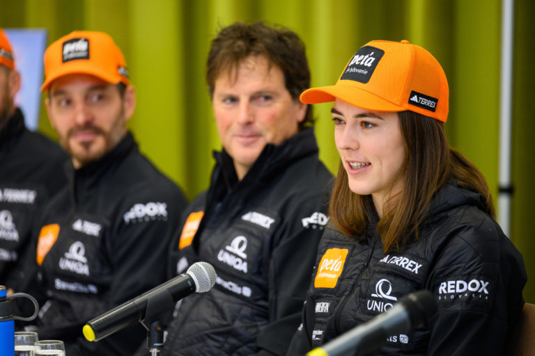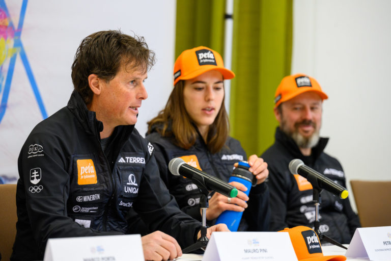 Zľava: Člen Niké Ski Team Petra Vlhová Marco Porta, tréner Petry Vlhovej Mauro Pini, slovenská reprezentantka v zjazdovom lyžovaní Petra Vlhová počas tlačovej konferencie pri príležitosti mediálneho dňa organizačného tímu Svetového pohára v zjazdovom lyžovaní žien Jasná 2024. Demänovská Dolina, 11. január 2024. Foto: SITA/Milo Fabian