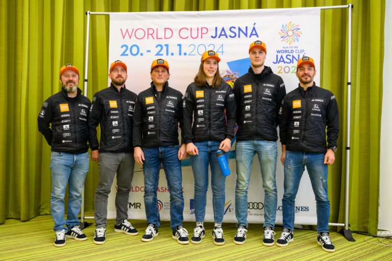 Zľava: Členovia Niké Ski Team Petra Vlhová Matej Gemza, Brice Bottolier, tréner Petry Vlhovej Mauro Pini, slovenská reprezentantka v zjazdovom lyžovaní Petra Vlhová, členovia tímu Kristián Piovarči a Marco Porta počas tlačovej konferencie pri príležitosti mediálneho dňa organizačného tímu Svetového pohára v zjazdovom lyžovaní žien Jasná 2024. Demänovská Dolina, 11. január 2024. Foto: SITA/Milo Fabian