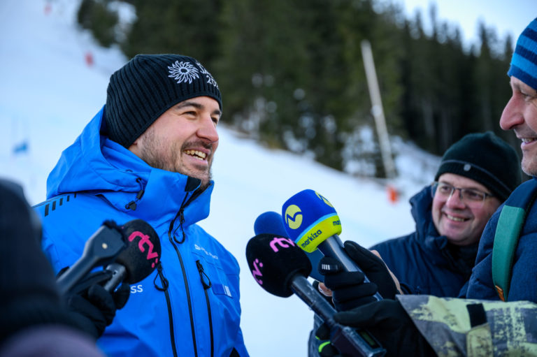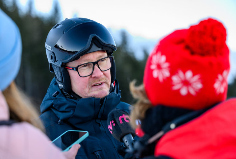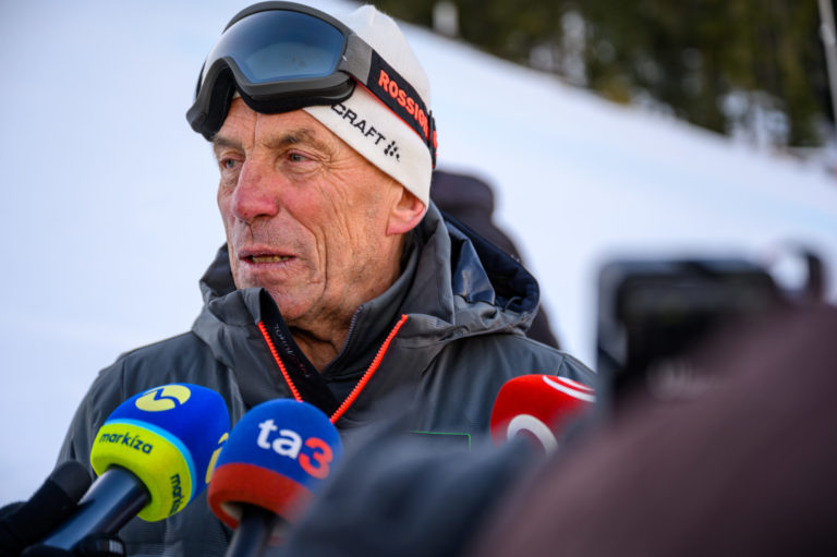 Marketingový manažér Svetového pohára v Jasnej Peter Pukalovič (vľavo) počas brífingu pri príležitosti kontroly pretekárskej trate zo strany kontrolného komisára FIS pred konaním Svetového pohára v zjazdovom lyžovaní žien Jasná 2024. Demänovská Dolina, 11. január 2024. Foto: SITA/Milo Fabian