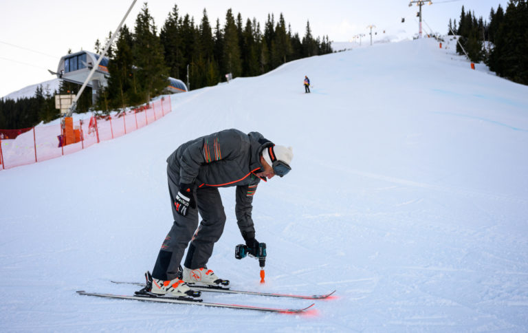 Odoberanie vzorky snehu kontrolným komisárom FIS pri príležitosti kontroly pretekárskej trate zo strany kontrolného komisára FIS pred konaním Svetového pohára v zjazdovom lyžovaní žien Jasná 2024. Demänovská Dolina, 11. január 2024. Foto: SITA/Milo Fabian
