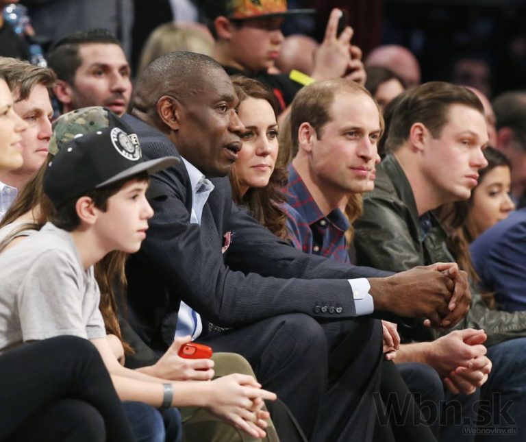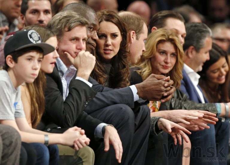 Kate, vojvodkyňa z Cambridgeu (štvrtá zľava v popredí), princ William (vedľa nej) a basketbalista Houston Rockets Dikembe Mutombo (druhý sprava) počas zápasu NBA medzi tímami Brooklyn Nets a Cleveland Cavaliers. Spojené štáty, New York, 8. decembra 2014. Foto: SITA/AP