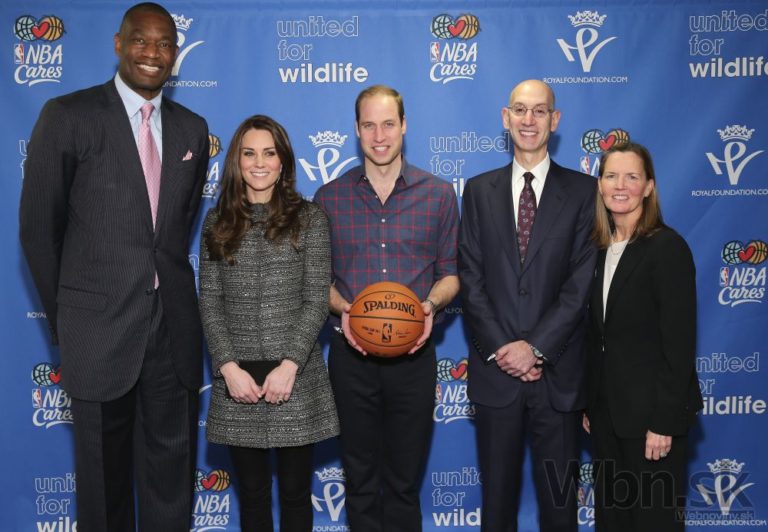 Kate, vojvodkyňa z Cambridgeu (druhá zľava), princ William (vedľa nej) pózujú pred fotografmi spolu s bývalým basketbalistom tímu Houston Rockets Dikembom Mutombom (vľavo) a majiteľom basketbalovej ligy NBA Adamom Silverom (druhý sprava). Spojené štáty, New York, 8. decembra 2014. Foto: SITA/AP