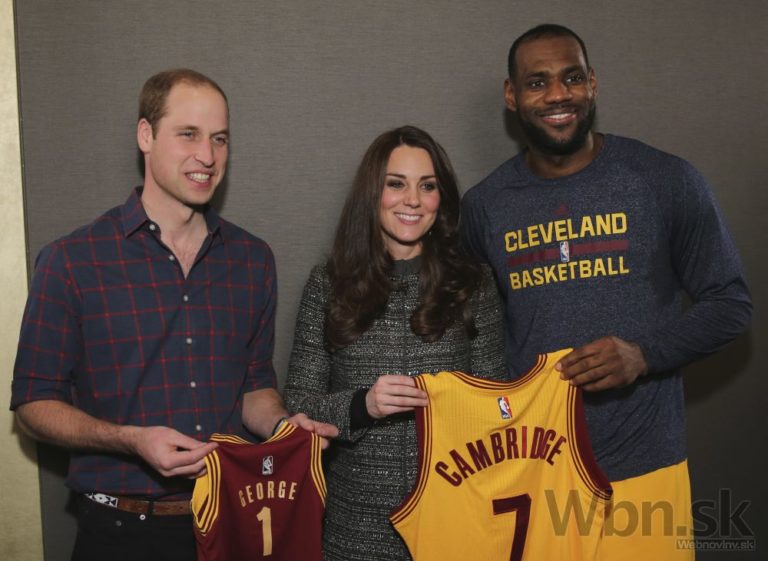 Kate, vojvodkyňa z Cambridgeu (uprostred), princ William (vľavo) pózujú pred fotografmi spolu s basketbalistom tímu Cleveland Cavaliers LeBronom Jamesom. Spojené štáty, New York, 8. decembra 2014. Foto: SITA/AP