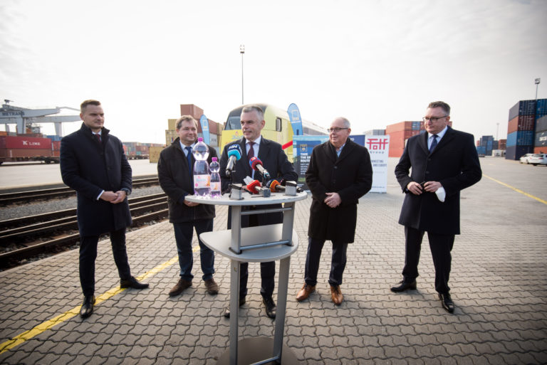 lak vypravili, zľava: Ladislav Balogh výkonný riaditeľ spoločnosti GEFCO Forwarding Slovakia s. r. o.; Peter Hrapko, Odbor stratégie dopravy Ministerstvo dopravy a výstavby SR; Jaroslav Kmeť, štátny tajomník Ministerstva dopravy a výstavby SR; Peter Križan, riaditeľ pre biznis developement a potraviny, BUDIŠ a. s.; Peter Kiss, generálny riaditeľ METRANS a. s. Foto: BUDIŠ a. s.