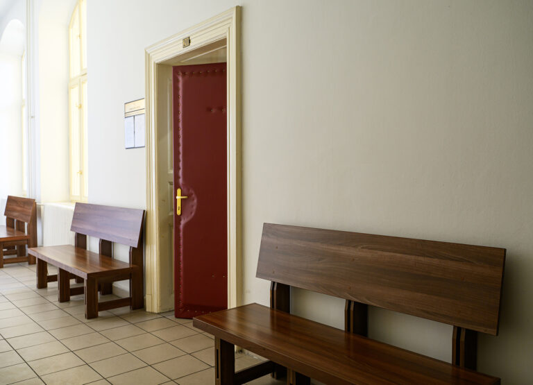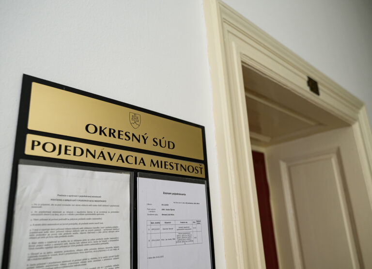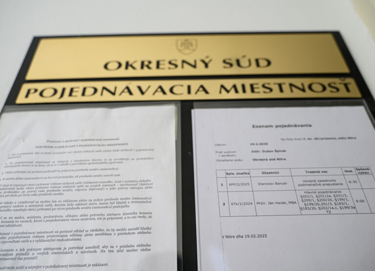 Miestnosť č. 20 krajského súdu v Nitre, v ktorej sa odohrávalo pojednávanie vo veci sexuálneho zneužívania. Obžalovaný je bývalý poslanec parlamentu Ján Herák. Nitra, 19. február 2024. Foto: SITA/Martin Havran