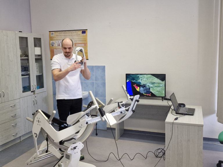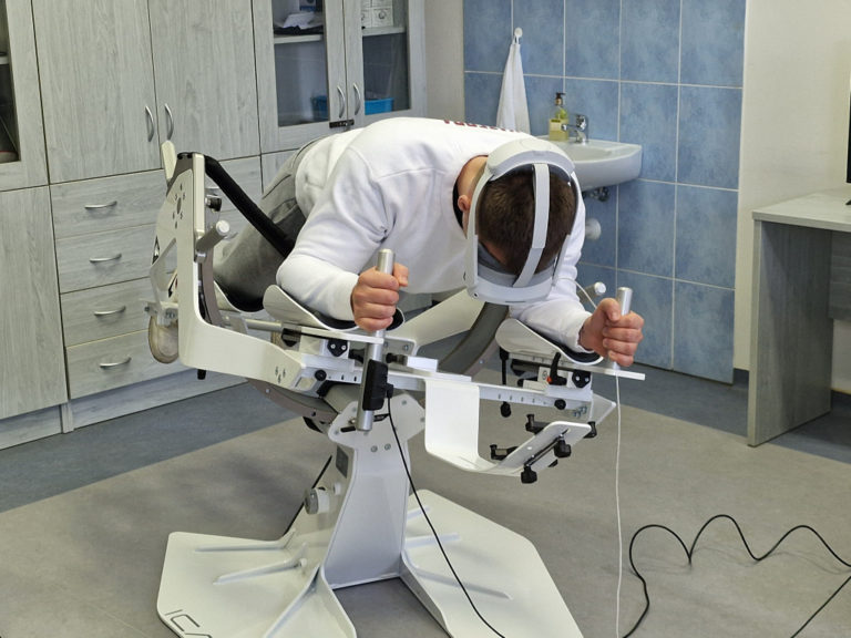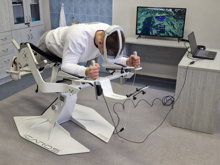 Figurant testuje prístroj ICAROS Health, slúžiaci na tréning jadra tela a rovnováhy u pacienta na neurorehabilitáciu, ktorý dostala Fakulta zdravotníckych odborov (FZO) Prešovskej univerzity (PU) v Prešove od Adeli Medical Center v Piešťanoch na výučbu a prax študentov fyzioterapie. Prešov, 27. február 2024. Foto: SITA/Ivan Kriššák.
