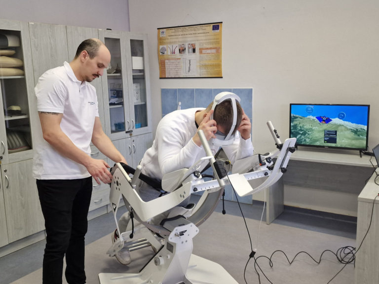 Figurant testuje prístroj ICAROS Health, slúžiaci na tréning jadra tela a rovnováhy u pacienta na neurorehabilitáciu, ktorý dostala Fakulta zdravotníckych odborov (FZO) Prešovskej univerzity (PU) v Prešove od Adeli Medical Center v Piešťanoch na výučbu a prax študentov fyzioterapie. Prešov, 27. február 2024. Foto: SITA/Ivan Kriššák
