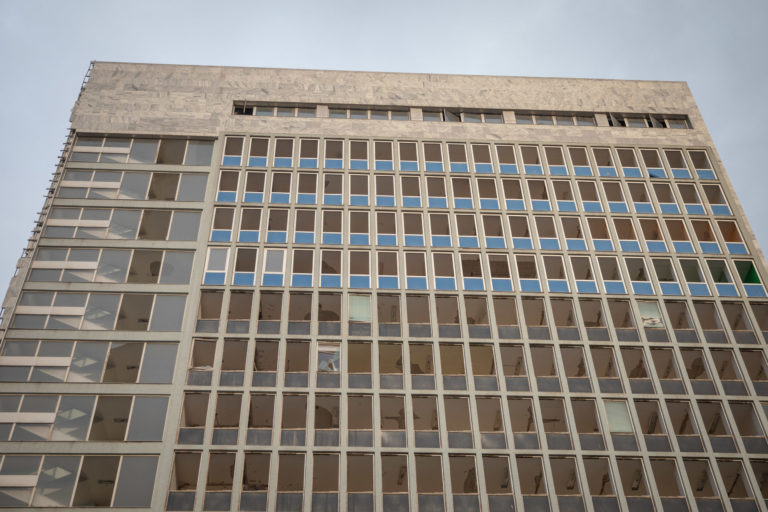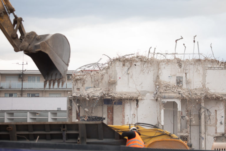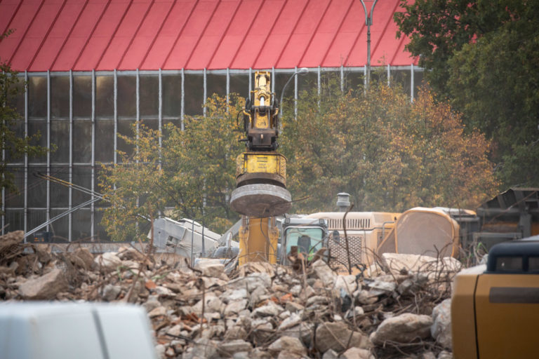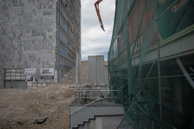 Pozostatky po bývalom Dome odborov, známom ako Istropolis počas búrania výškovej administratívnej budovy bývalého Domu Revolučného odborového hnutia (ROH) v rámci prípravy projektu Nový Istropolis na Trnavskom Mýte v Bratislave. Bratislava, 10. október 2022. Foto: SITA/Diana Černáková