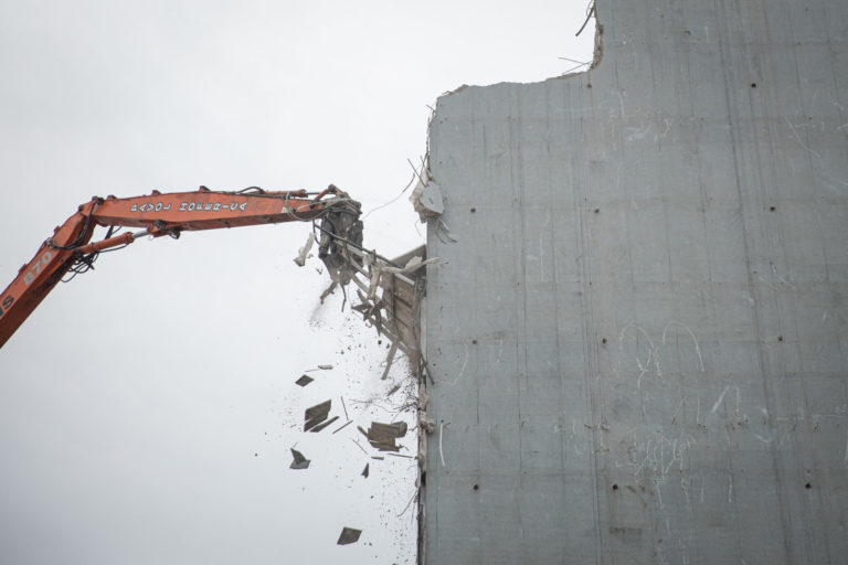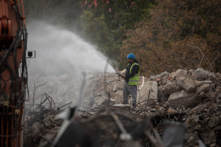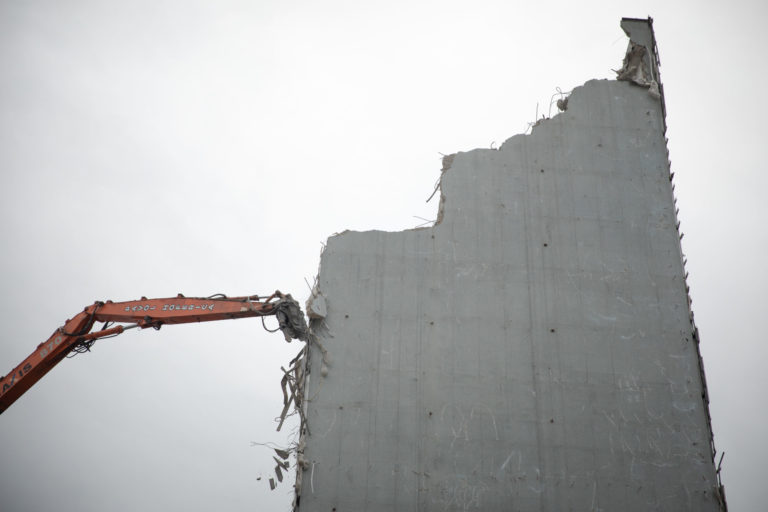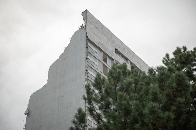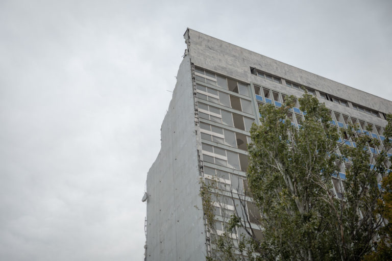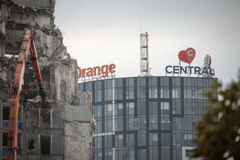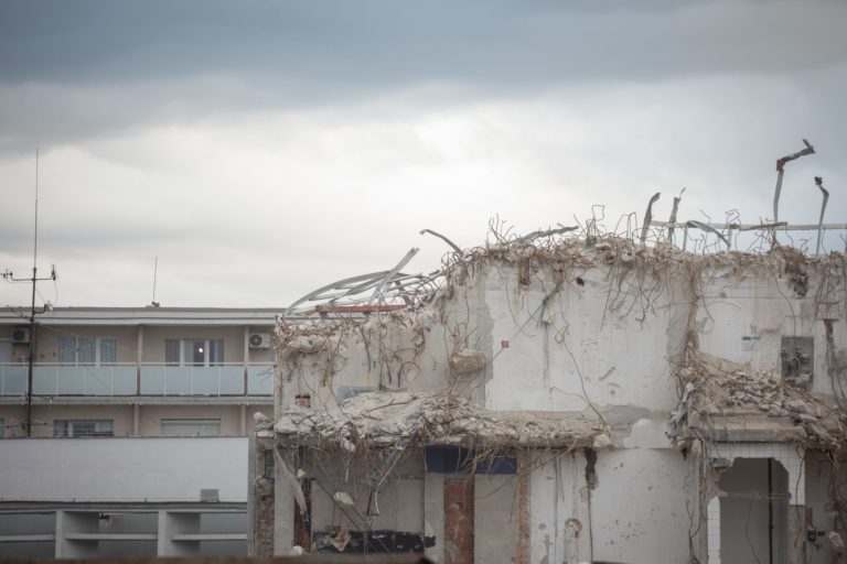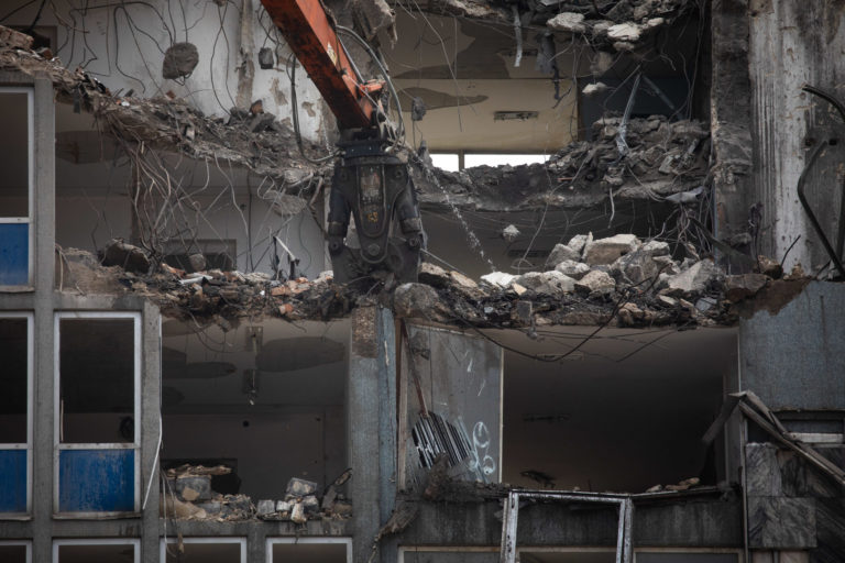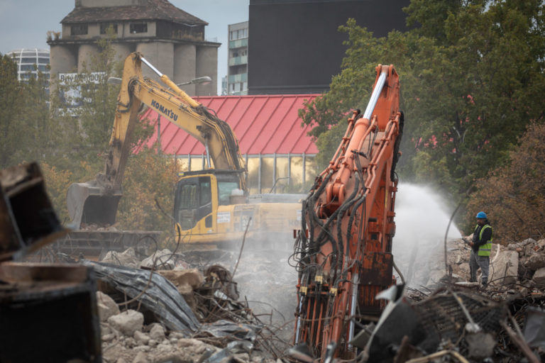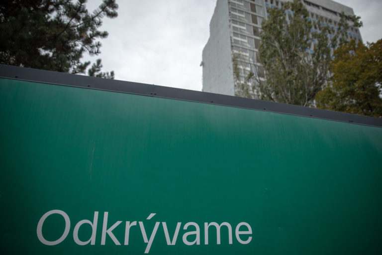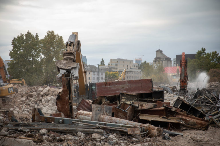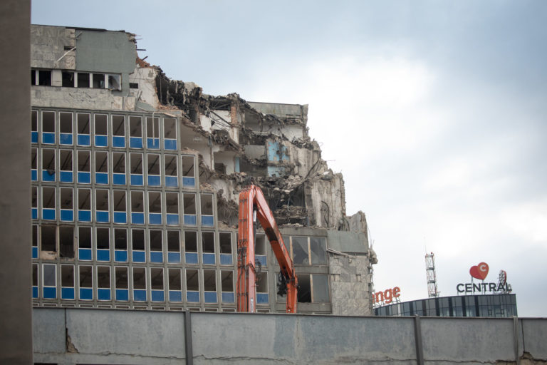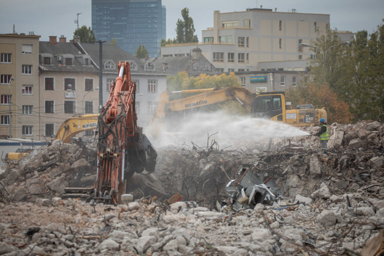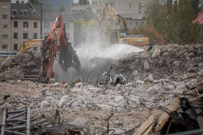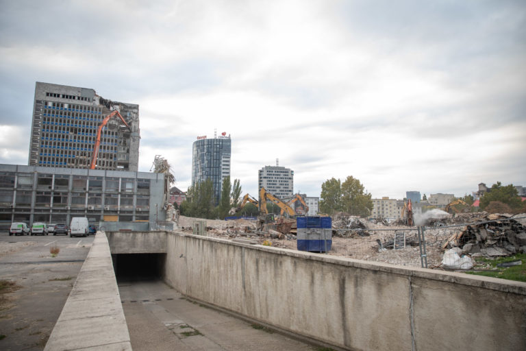Pozostatky po bývalom Dome odborov, známeho ako Istropolis počas búrania výškovej administratívnej budovy bývalého Domu Revolučného odborového hnutia (ROH) v rámci prípravy projektu Nový Istropolis na Trnavskom Mýte v Bratislave. Bratislava, 10. október 2022. Foto: SITA/Diana Černáková