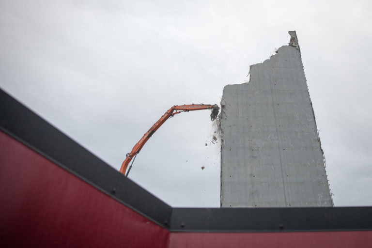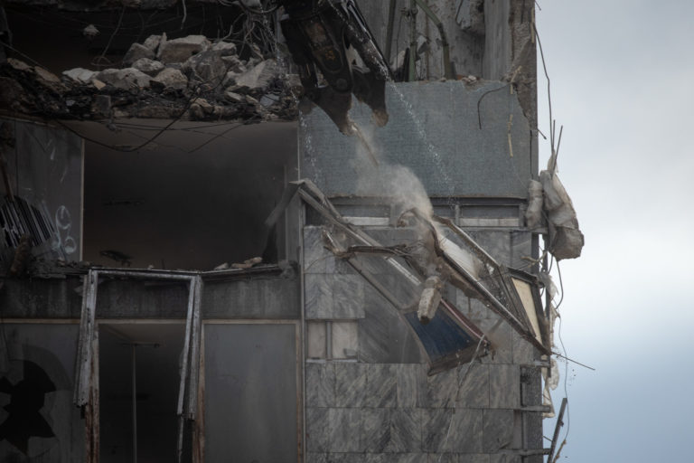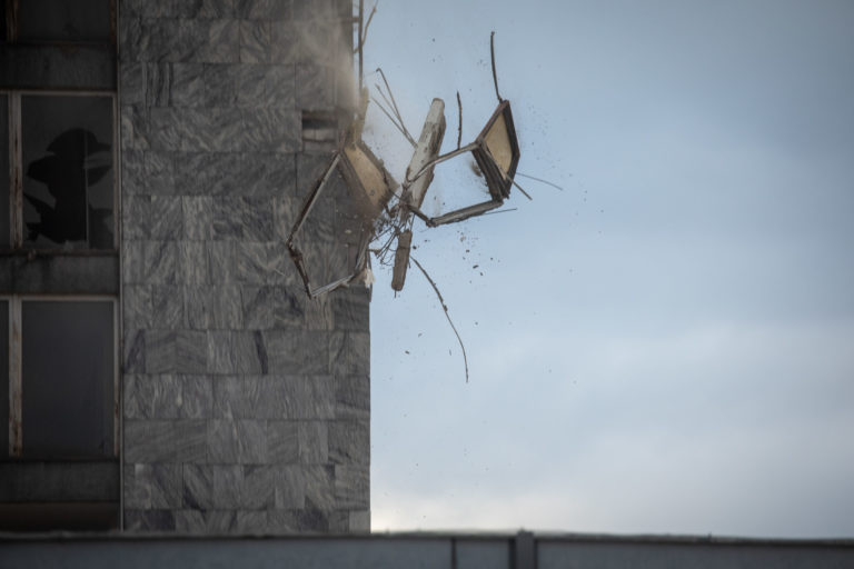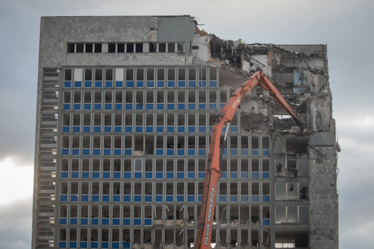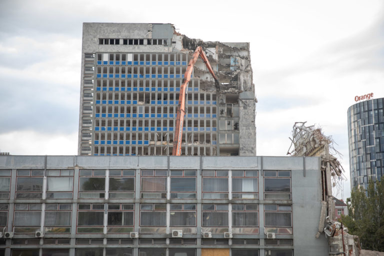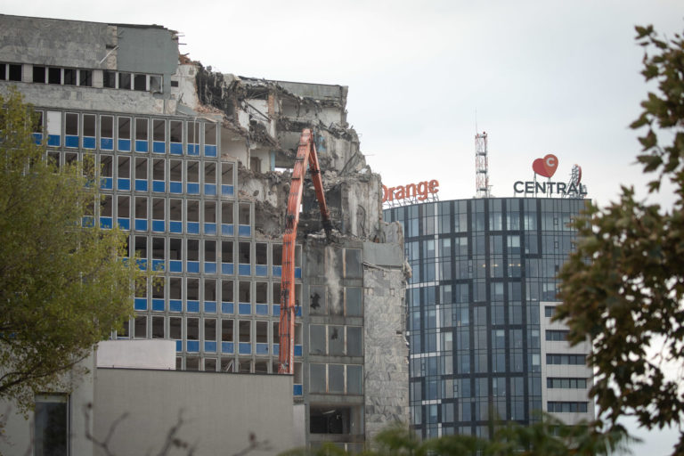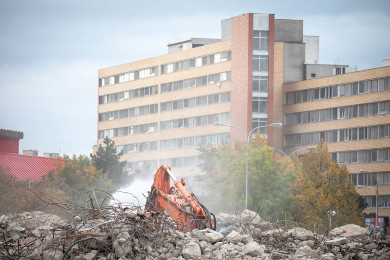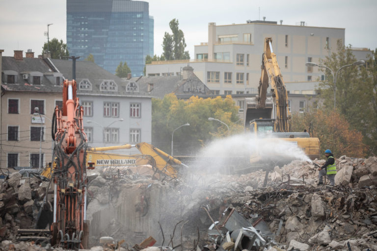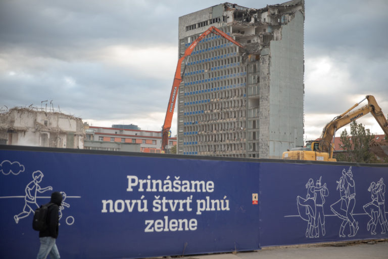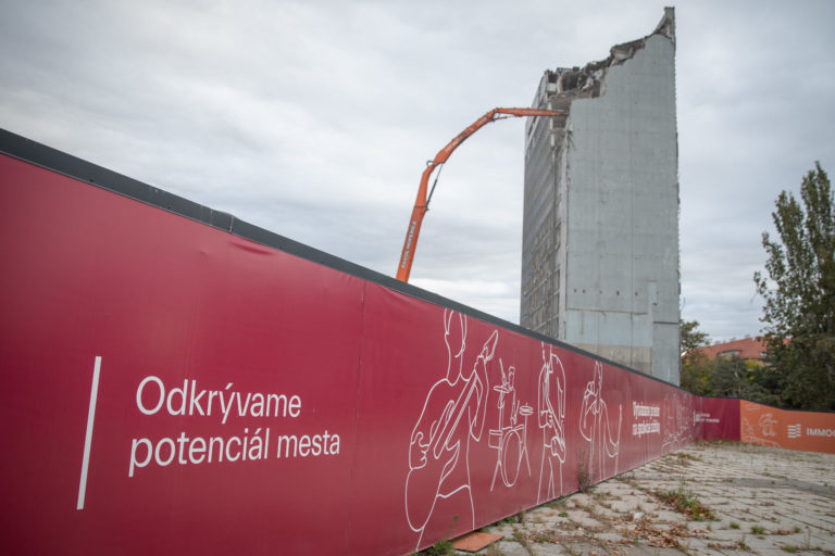 Búranie výškovej administratívnej budovy bývalého Domu Revolučného odborového hnutia (ROH) v rámci prípravy projektu Nový Istropolis na Trnavskom Mýte v Bratislave. Bratislava, 10. október 2022. Foto: SITA/Diana Černáková