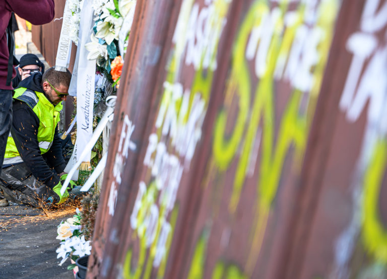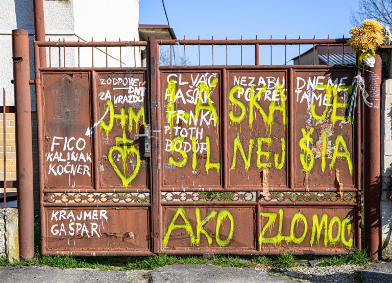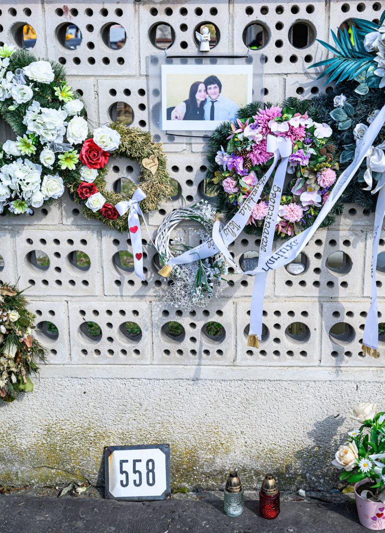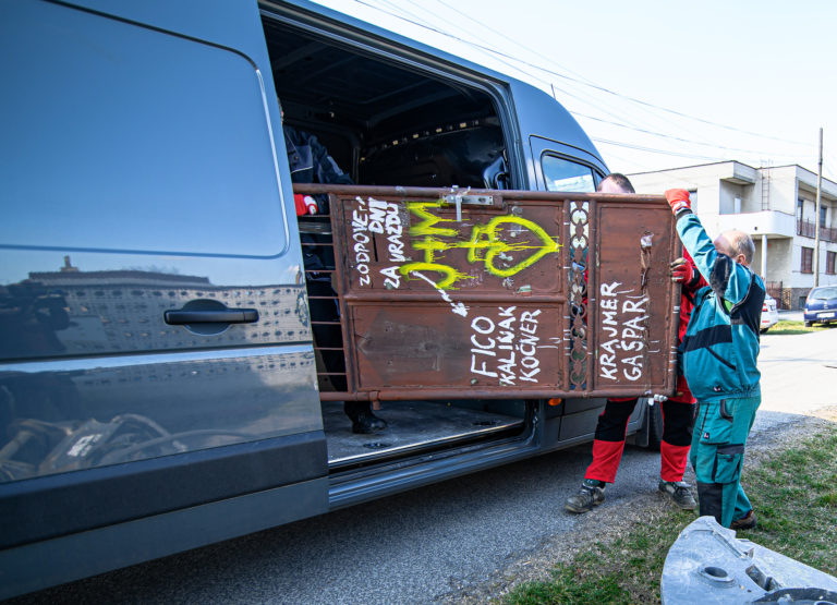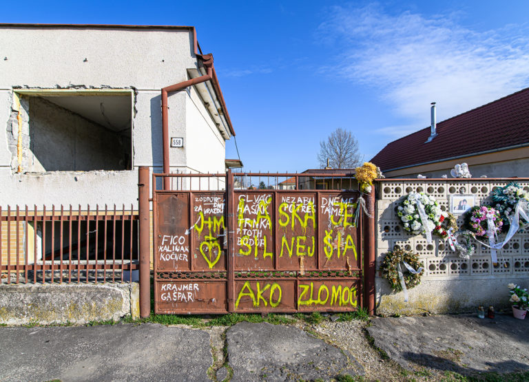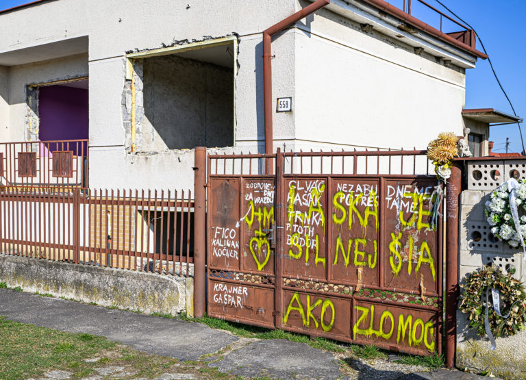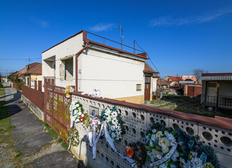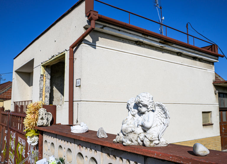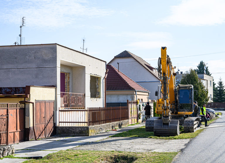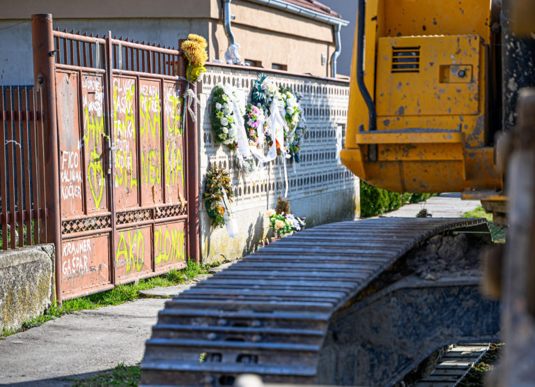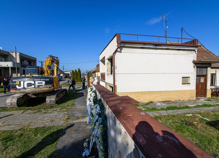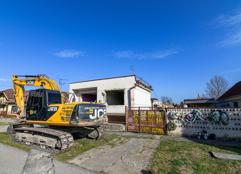 Začatie búrania rodinného domu zavraždeného novinára Jána Kuciaka a jeho snúbenice Martiny Kušnírovej vo Veľkej Mači v okrese Galanta. Trnavský samosprávny kraj následne na pozemku postaví Pamätník slobody slova. Veľká Mača, 21. marec 2023. Foto: SITA/Martin Havran.
