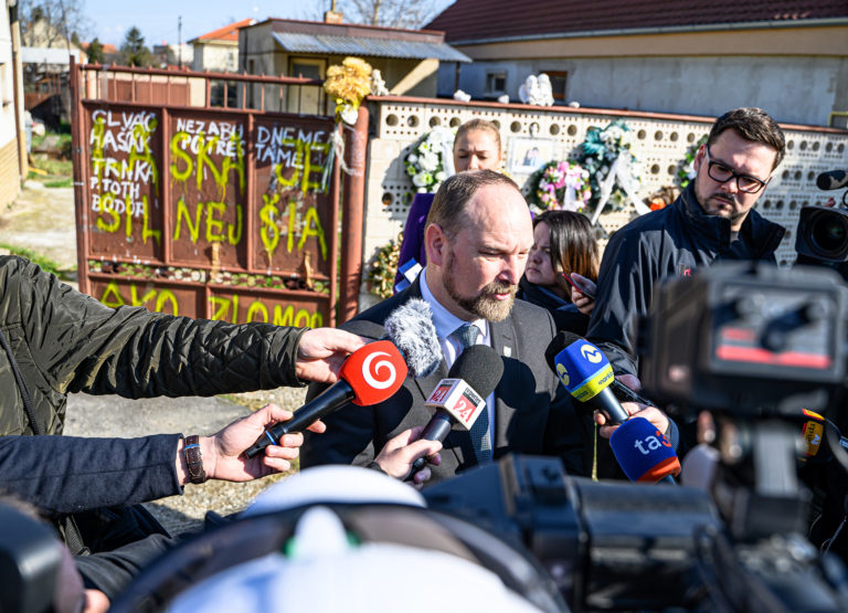 Župan TTSK Jozef Viskupič (v popredí) počas tlačového brífingu pred začiatkom búrania rodinného domu zavraždeného novinára Jána Kuciaka a jeho snúbenice Martiny Kušnírovej vo Veľkej Mači v okrese Galanta.  Trnavský samosprávny kraj (TTSK) následne na pozemku postaví Pamätník slobody slova. Veľká Mača, 21. marec 2023. Foto: SITA/Martin Havran.