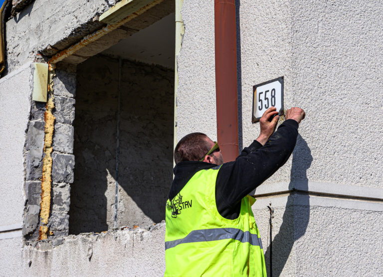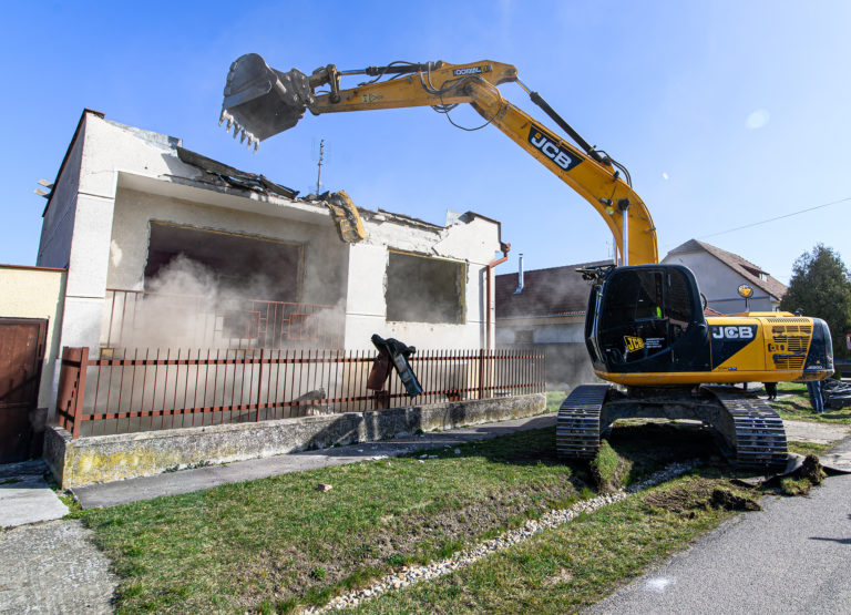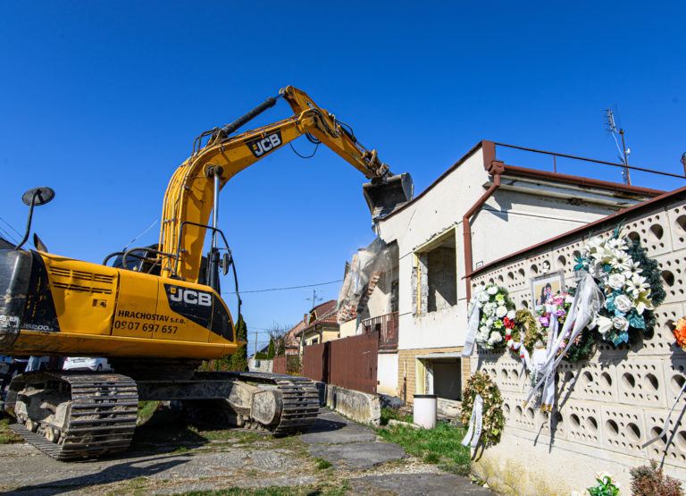 Začatie búrania rodinného domu zavraždeného novinára Jána Kuciaka a jeho snúbenice Martiny Kušnírovej vo Veľkej Mači v okrese Galanta. Trnavský samosprávny kraj následne na pozemku postaví Pamätník slobody slova. Veľká Mača, 21. marec 2023. Foto: archívne, SITA/Martin Havran.