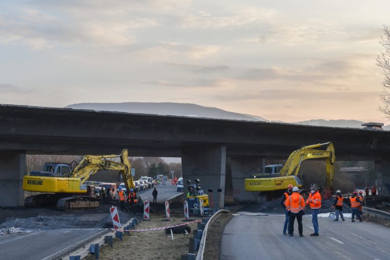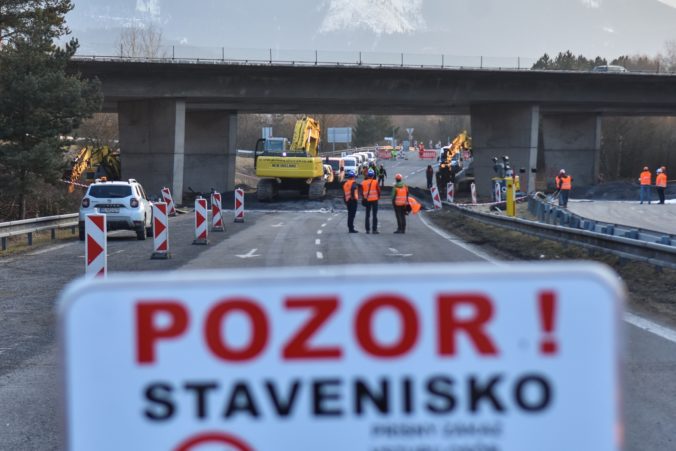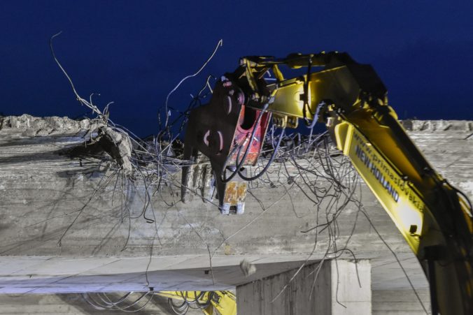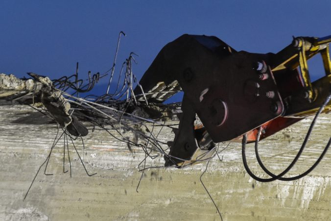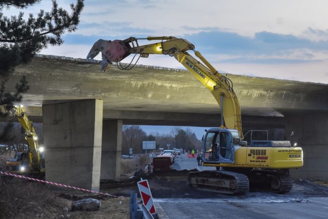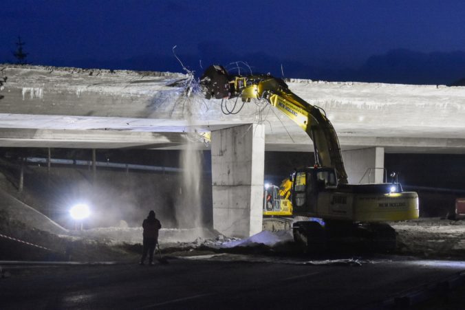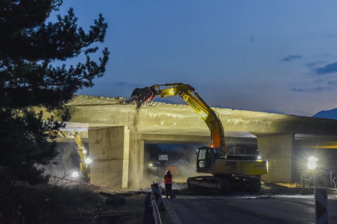 Búracie práce na ľavom diaľničnom moste D1-229 v križovatke Podbanské v smere na Liptovský Mikuláš, ktorý demolujú z dôvodu zlého technického stavu. Vavrišovo, 26. marec 2021. Foto: SITA/Oliver Ondráš