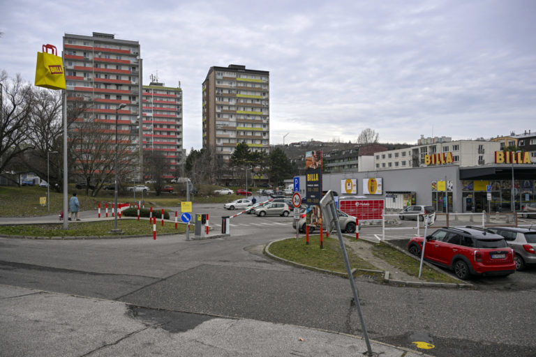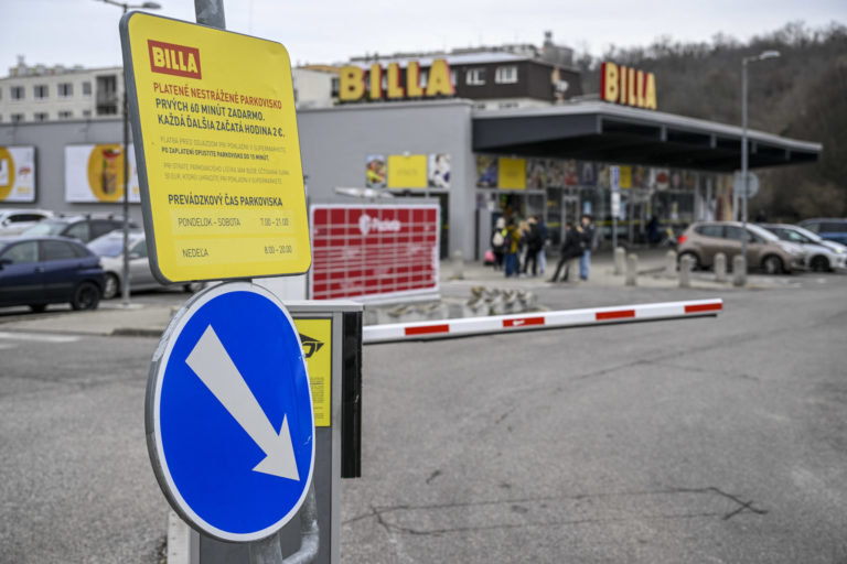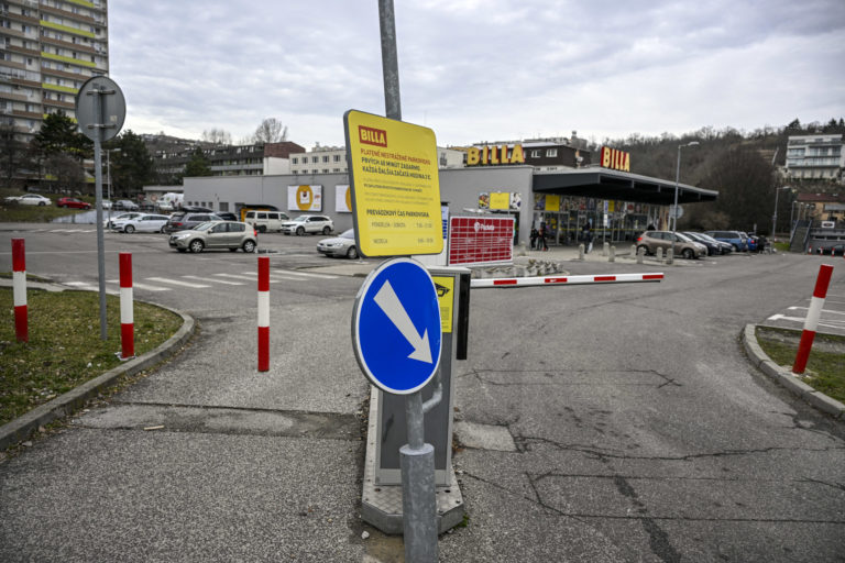 Parkovisko pri predajni Billa na Segnerovej ulici v Karlovej Vsi v Bratislave, ktoré bude počas druhého štvrťroka po záverečných hodinách až do otvorenia prevádzky prístupné občanom s paušálnou cenou jedno euro na noc z dôvodu búrania starého parkoviska na Ulici Ľudovíta Fullu, namiesto ktorého vyrastie dvojpodlažný parkovací dom. Bratislava, 9. február 2024. Foto: SITA/Milan Illík.