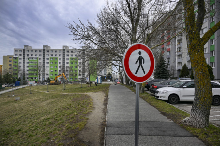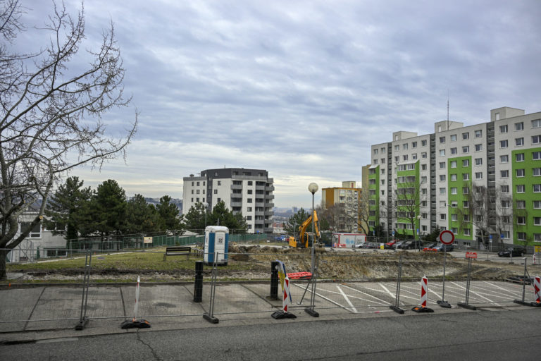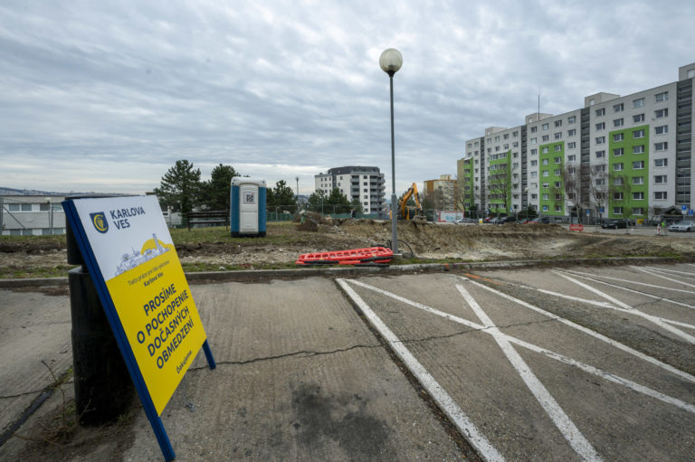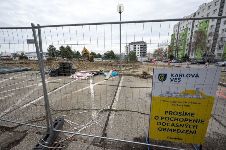 Stavenisko (v pozadí) na Ulici Ľudovíta Fullu v bratislavskej Karlovej Vsi počas búrania starého parkoviska, namiesto ktorého vyrastie dvojpodlažný parkovací dom. Celkovo bude k dispozícii 72 parkovacích miest. Bratislava, 9. február 2024. Foto: SITA/Milan Illík.
