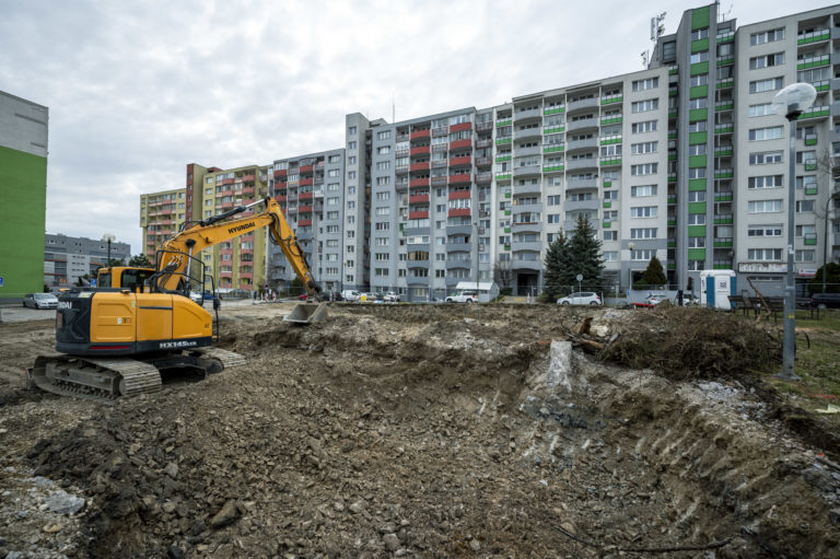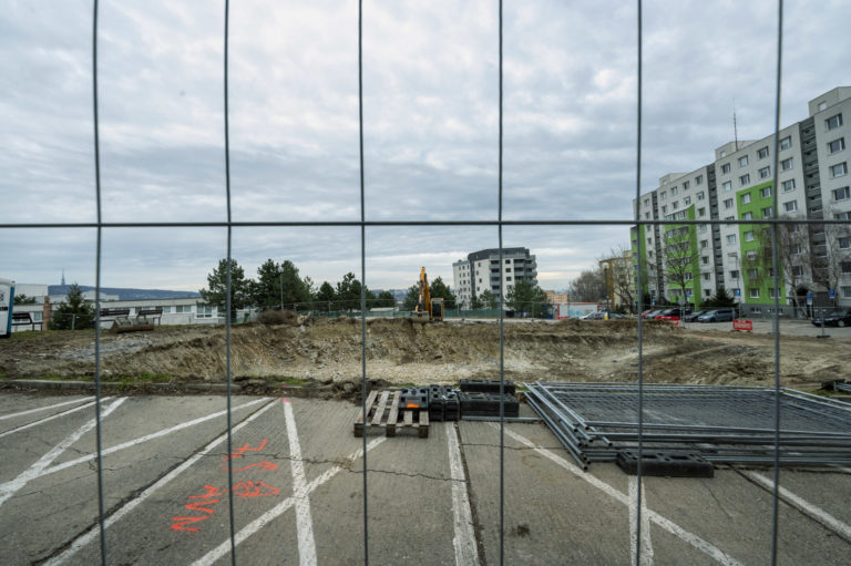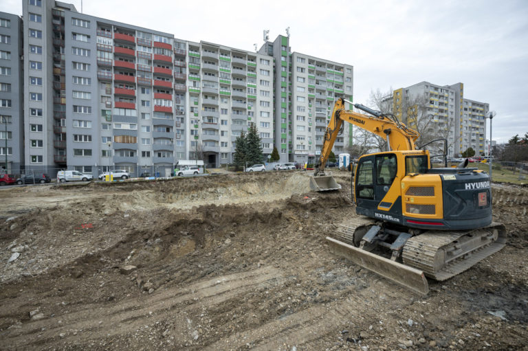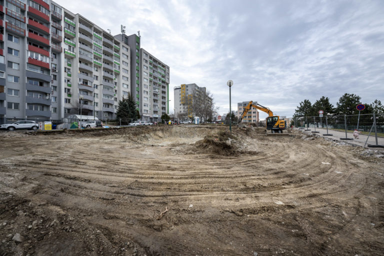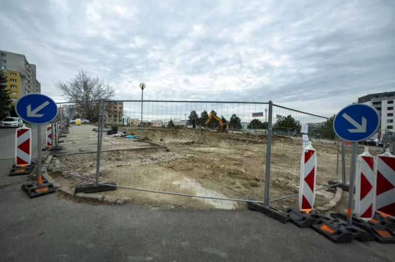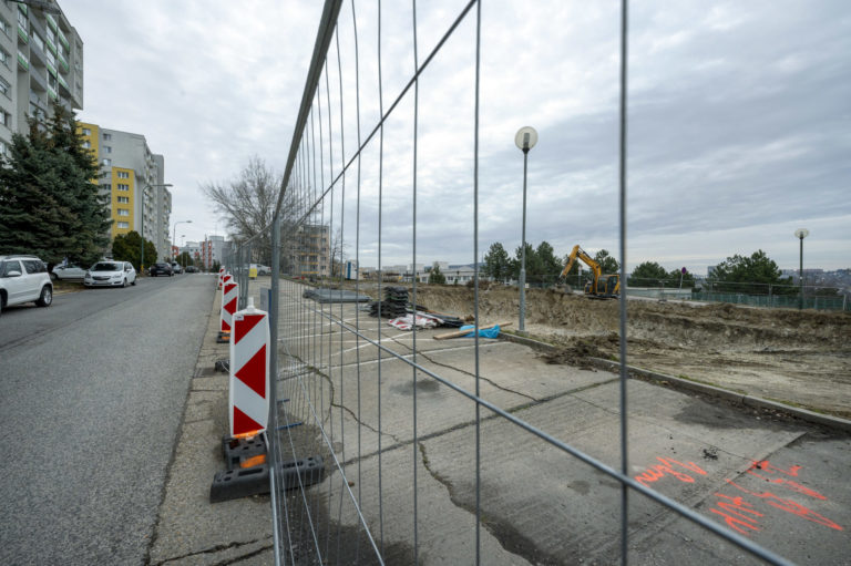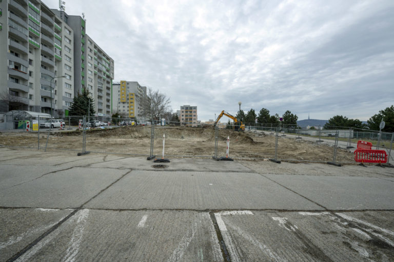 Stavenisko na Ulici Ľudovíta Fullu v bratislavskej Karlovej Vsi počas búrania starého parkoviska, namiesto ktorého vyrastie dvojpodlažný parkovací dom. Celkovo bude k dispozícii 72 parkovacích miest. Bratislava, 9. február 2024. Foto: SITA/Milan Illík.