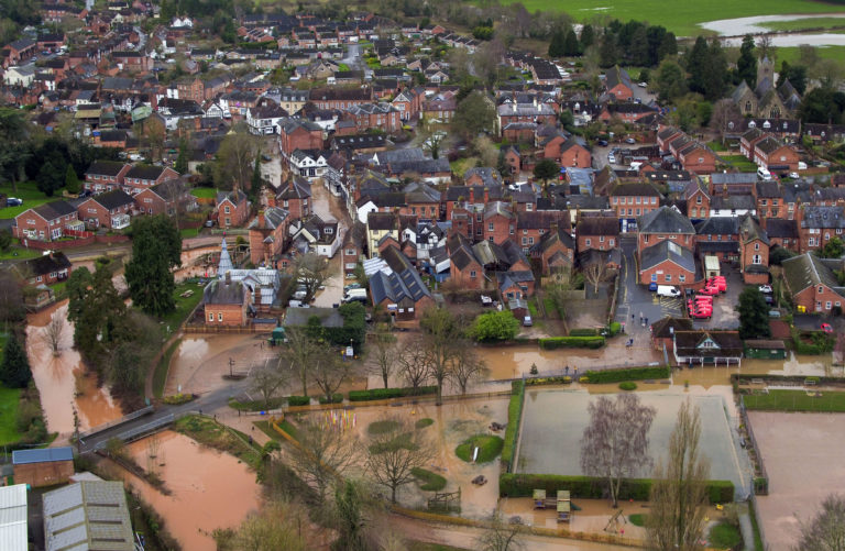 Búrka Dennis cez víkend udrela na Britské ostrovy. Pohľad na mesto Tenbury Wells. Foto: SITA/AP, Steve Parson