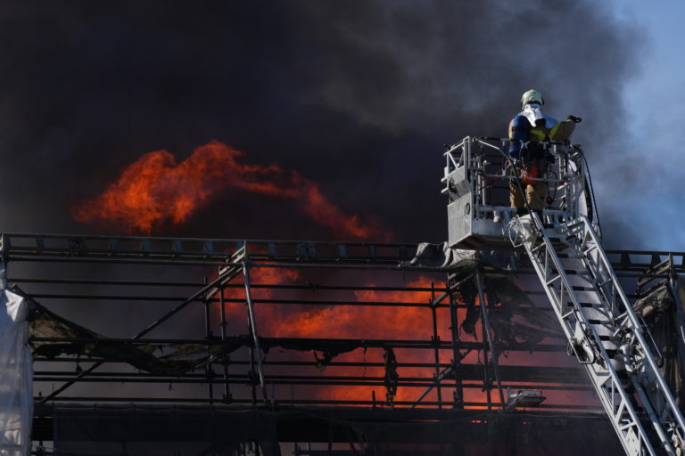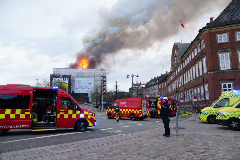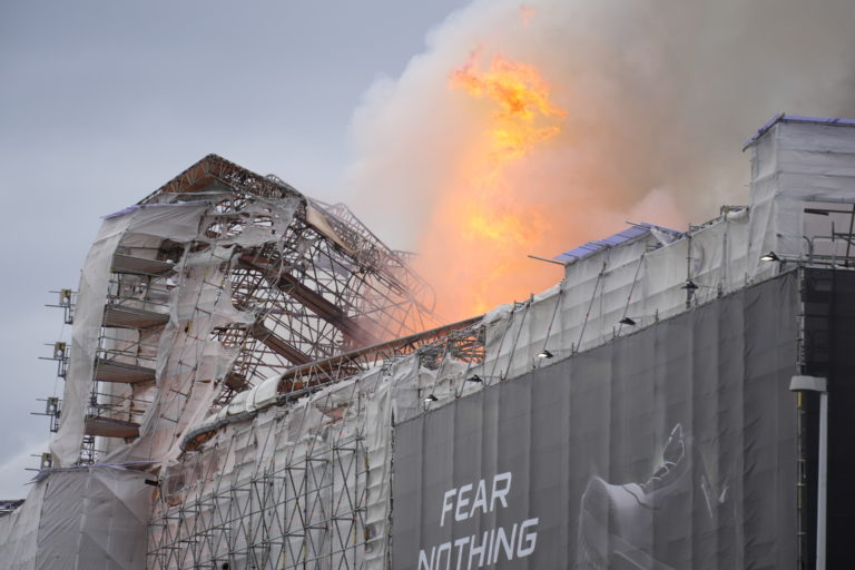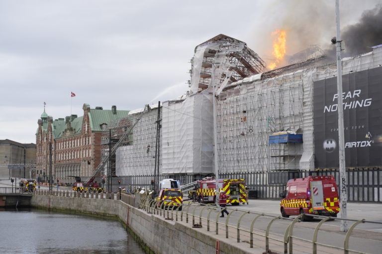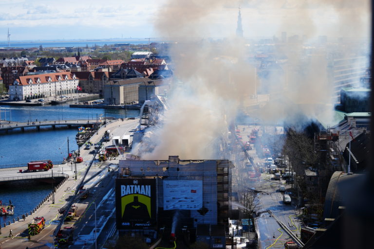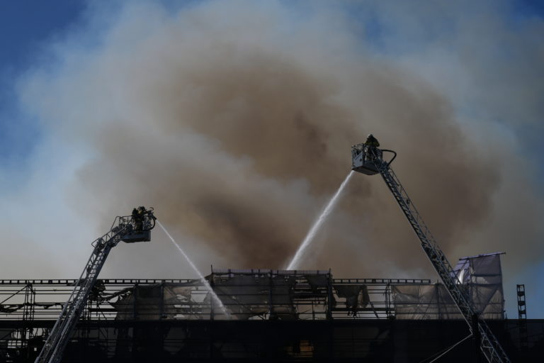 Hasiči zasahujú pri požiari historickej budovy Burzy v dánskej Kodani, v dôsledku ktorého sa zrútila aj jej ikonická veža. Kodaň, 16. apríl 2024. Foto: Ida Marie Odgaard/Ritzau Scanpix via AP