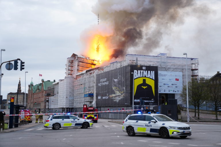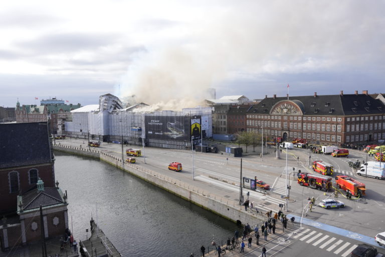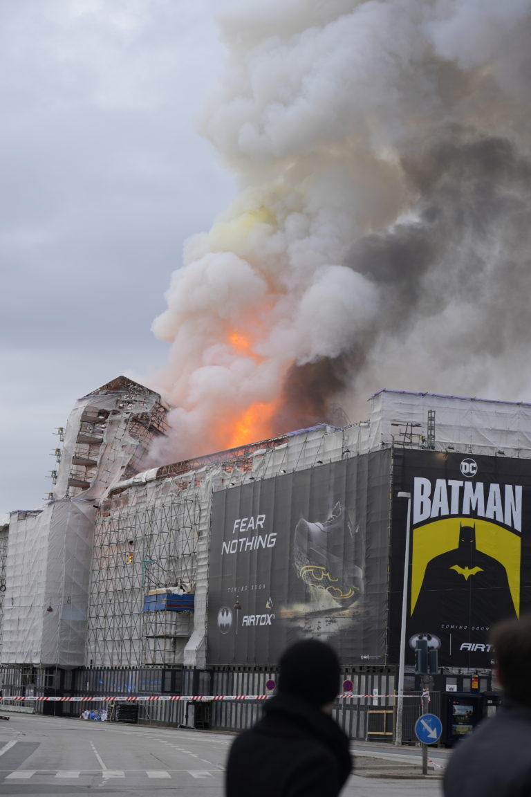 Strechu burzy cenných papierov zo 17. storočia Børsen, ktorá bola kedysi dánskym finančným centrom, v utorok zachvátili plamene. Kodaň, 16. apríl 2024. Foto: Ida Marie Odgaard/Ritzau Scanpix via AP.