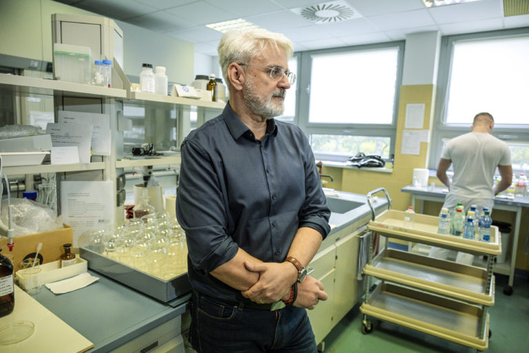 Vedúci akreditovaných laboratórii Bratislavskej vodárenskej spoločnosti (BVS) Marian Studenič (vľavo) počas analýzy prinesených vzoriek vody zo studní v laboratóriách BVS v rámci Svetového dňa vody. Bratislava, 22. marec 2024. Foto: SITA/Milan Illík