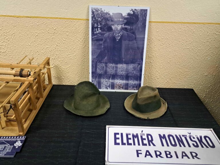 Fotografia posledného modrotlačiara v podtatranskej obci Hranovnica Elemíra Montška (1900-1974), spolu s tabuľou z budovy jeho dielne, a klobúkmi, ktoré zakladal na oči koňovi pri mangľovaní plátna v stodole. Hranovnica, 16. október 2024. Foto: SITA/Mária Frisová