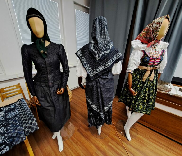 Ukážka modrotlače na krojoch z bývalej modrotlačiarenskej dielne v podtatranskej obci Hranovnica, ktorá si pripomína 200. výročie založenia a zároveň 50. výročie ukončenia. Bola jednou z najdlhšie fungujúcich dielní na Slovensku, plátno v nej farbili od roku 1824 do roku 1974. Hranovnica, 16. október 2024. Foto: SITA/Mária Frisová