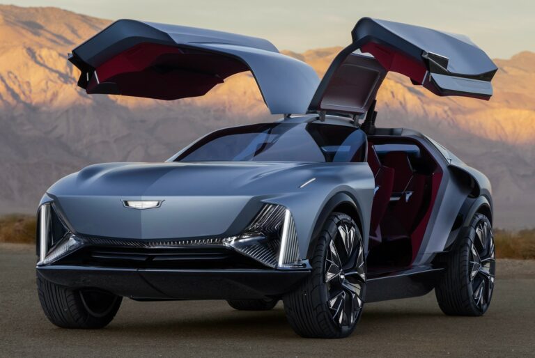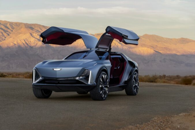 Front 3/4 view of the Cadillac Elevated Velocity cToto je Cadillac Elevated Velocity. Nič také šokujúce ešte Cadillac nevytvoril.oncept in Vapor Blue with the gull-wing doors open with the desert in the background. Foto: Cadillac Elevated Velocity