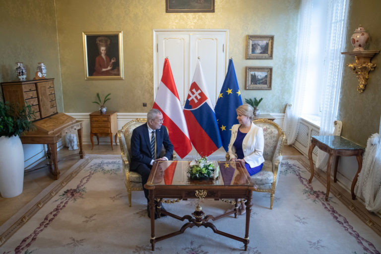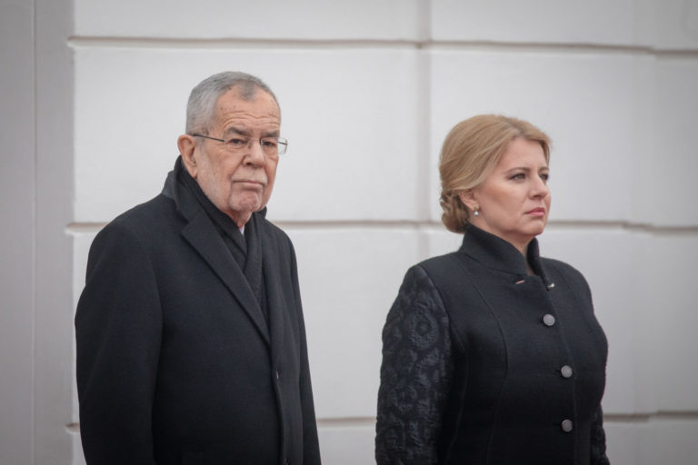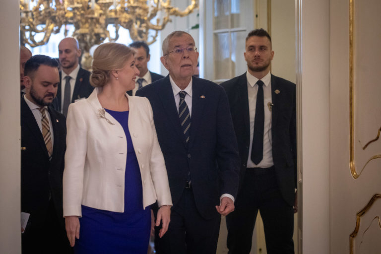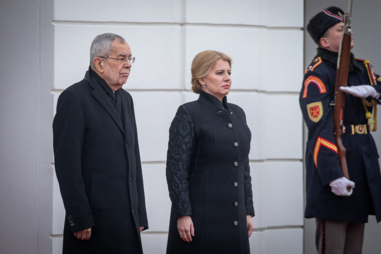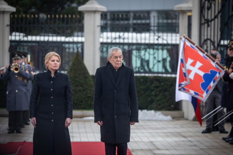 Zľava: Prezident Rakúska Alexander Van der Bellen a prezidentka SR Zuzana Čaputová počas prijatia prezidentkou SR v Prezidentskom paláci v rámci oficiálnej návštevy prezidenta Rakúskej republiky na Slovensku. Bratislava, 31. január 2023. Foto: SITA/Diana Černáková