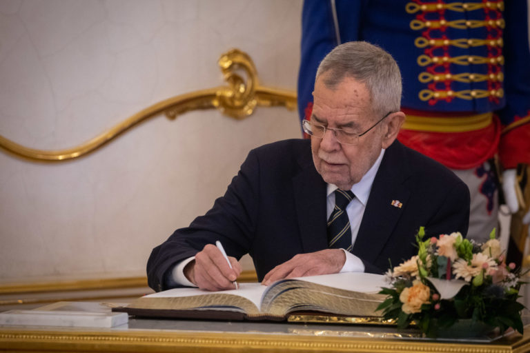 Prezident Rakúska Alexander Van der Bellen sa podpisuje do knihy hostí počas prijatia prezidentkou SR v Prezidentskom paláci pri príležitosti oficiálnej návštevy prezidenta Rakúskej republiky na Slovensku. Bratislava, 31. január 2023. Foto: SITA/Diana Černáková