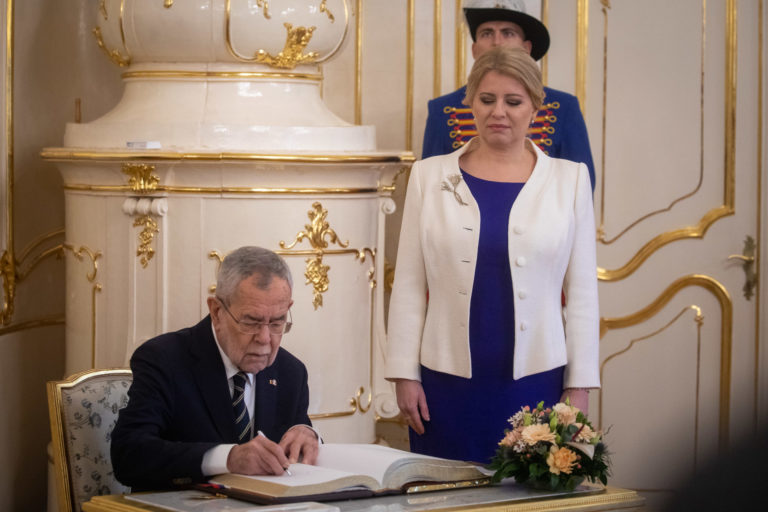 Zľava: Prezident Rakúska Alexander Van der Bellen a prezidentka SR Zuzana Čaputová počas podpisu do knihy hostí v rámci prijatia prezidentkou SR v Prezidentskom paláci pri príležitosti oficiálnej návštevy prezidenta Rakúskej republiky na Slovensku. Bratislava, 31. január 2023. Foto: SITA/Diana Černáková