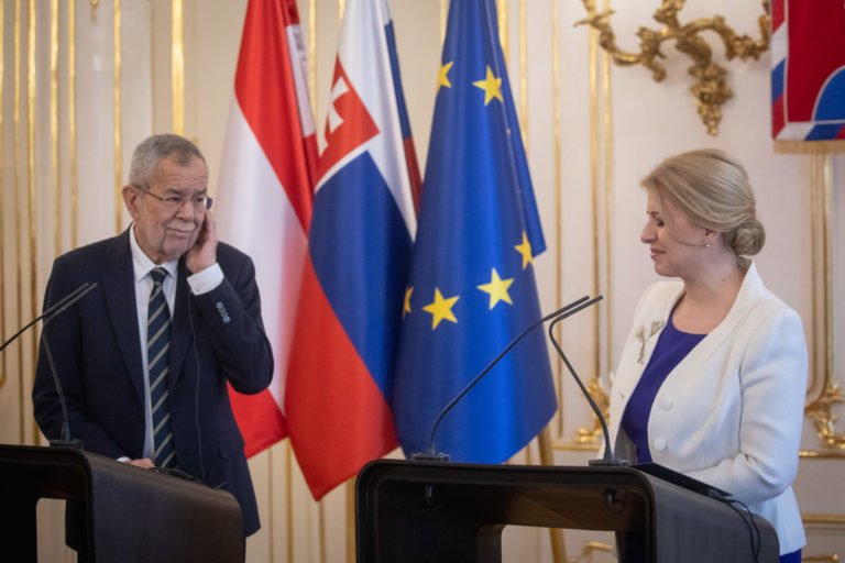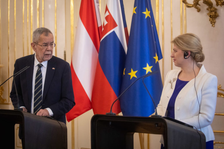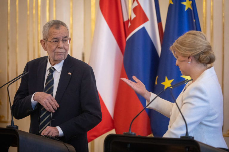 Zľava: Prezident Rakúska Alexander Van der Bellen a prezidentka SR Zuzana Čaputová počas tlačovej konferencie po prijatí prezidenta Rakúska prezidentkou SR v Prezidentskom paláci v rámci oficiálnej návštevy prezidenta Rakúskej republiky na Slovensku. Bratislava, 31. január 2023. Foto: SITA/Diana Černáková