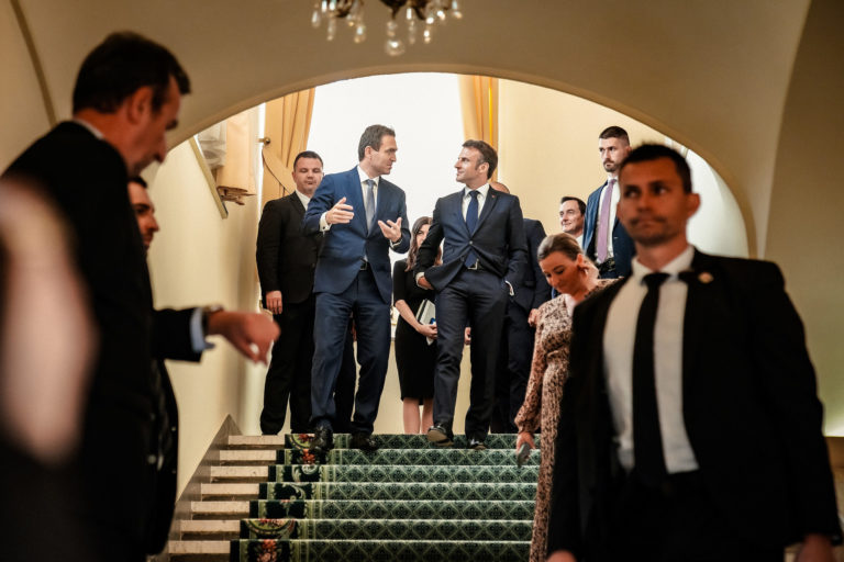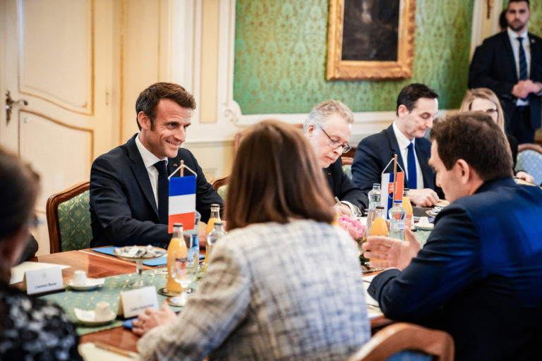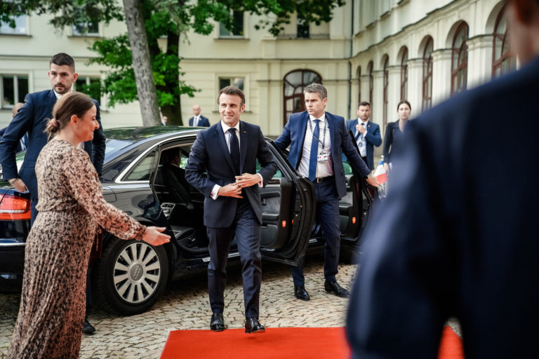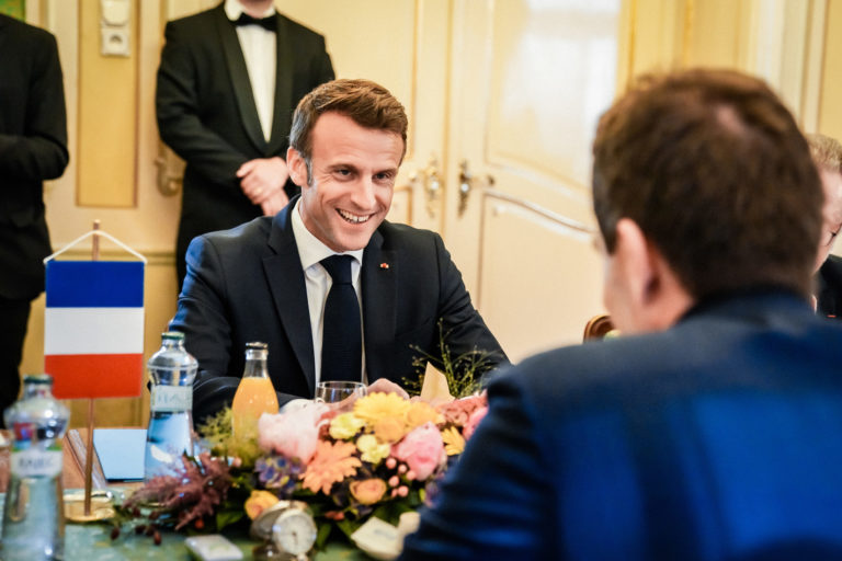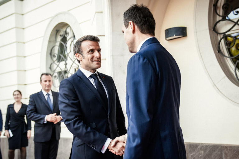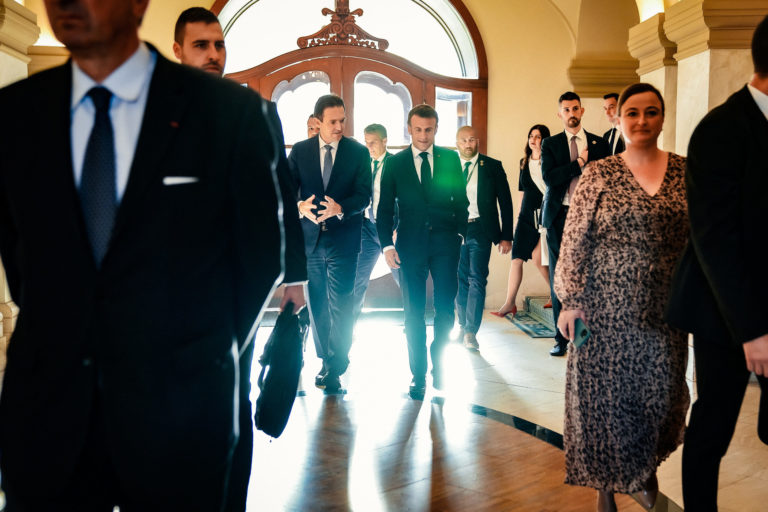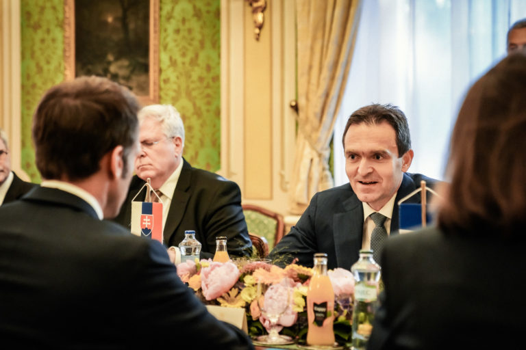 Uprostred vľavo: Prezident Francúzskej republiky Emmanuel Macron počas prijatia premiérom SR na Úrade vlády SR pri príležitosti oficiálnej návštevy prezidenta Francúzska na Slovensku. Bratislava, 31. máj 2023. Foto: SITA/Úrad vlády SR