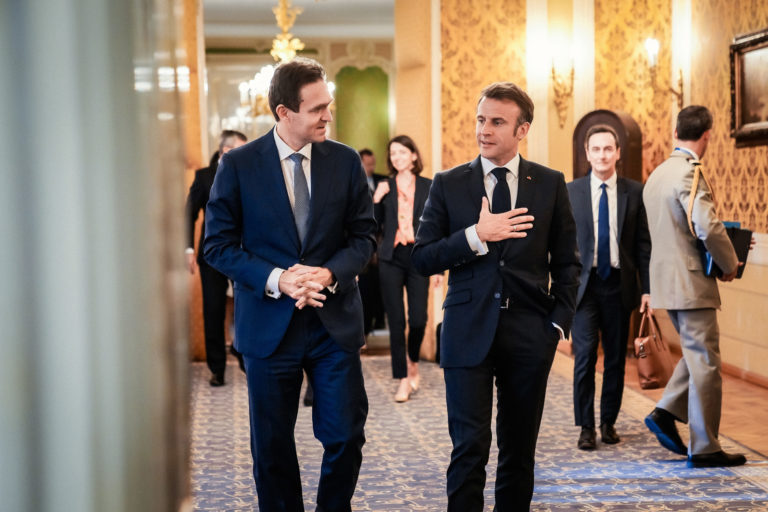 Zľava: Prezident Francúzskej republiky Emmanuel Macron a premiér SR Ľudovít Ódor počas prijatia francúzskeho prezidenta premiérom SR na Úrade vlády SR pri príležitosti oficiálnej návštevy prezidenta Francúzska na Slovensku. Bratislava, 31. máj 2023. Foto: SITA/Úrad vlády SR