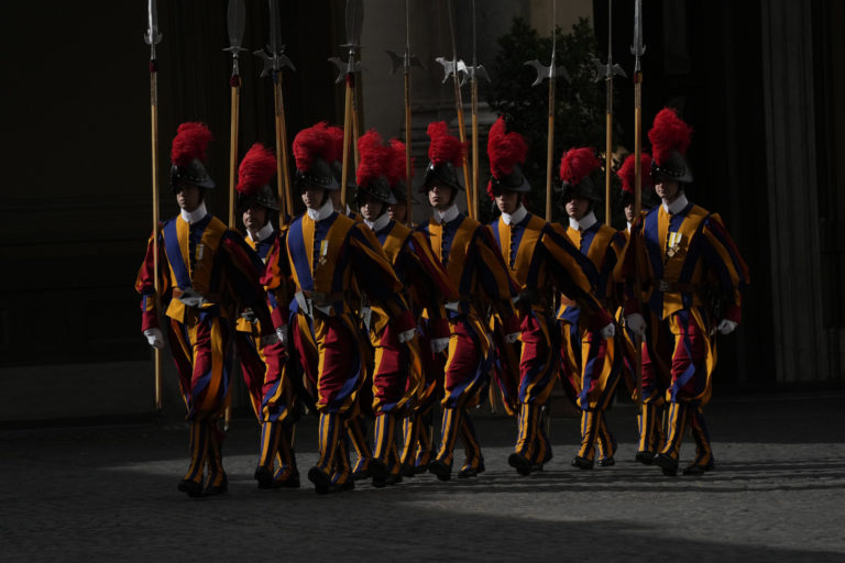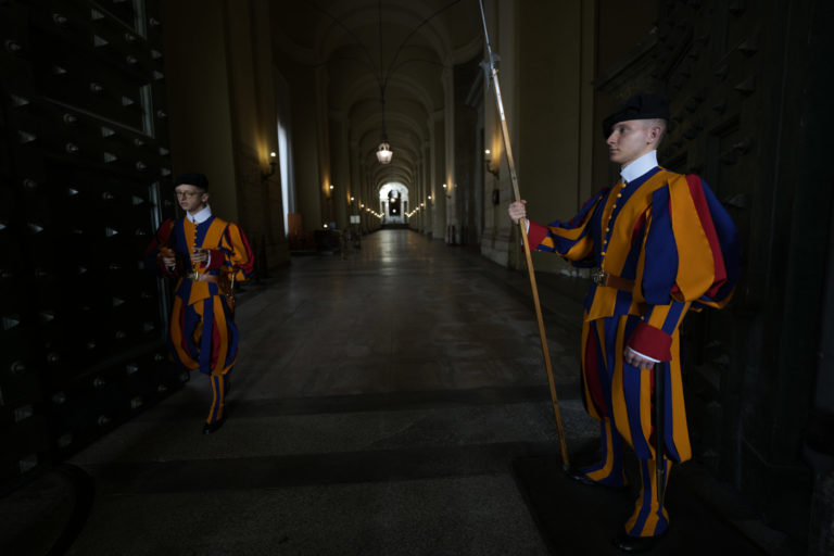 Pápežská švajčiarska garda v tradičnej renesančnej uniforme hliadkuje pri oficiálnom vchode do Apoštolského paláca vo Vatikáne. Foto: SITA/AP