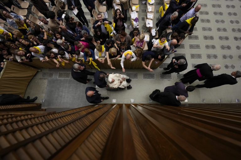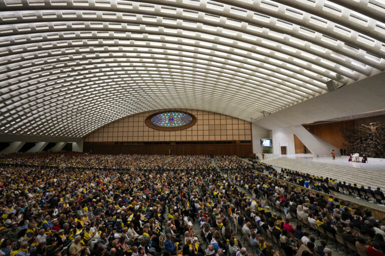 Pápež František na stretnutí s členmi združení kresťanských pracovníkov v Aule Pavla VI. vo Vatikáne. Foto: SITA/AP