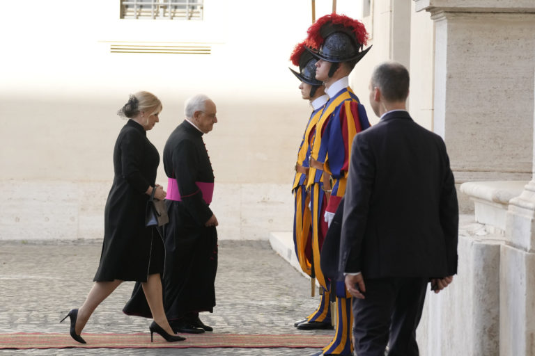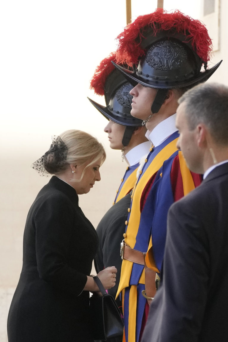 Slovenská prezidentka Zuzana Čaputová (vľavo) prichádza na Nádvorie svätého Damasa vo Vatikáne na súkromnú audienciu s pápežom Františkom. Foto: SITA/AP