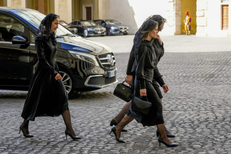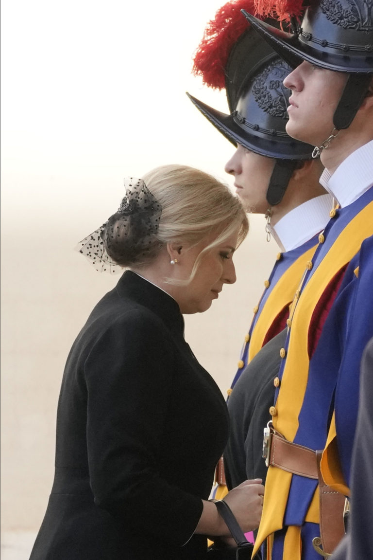 Slovenskú prezidentku Zuzanu Čaputovú (vľavo) vítajú vatikánski šľachtici, keď prichádza  na súkromnú audienciu s pápežom Františkom. Foto: SITA/AP