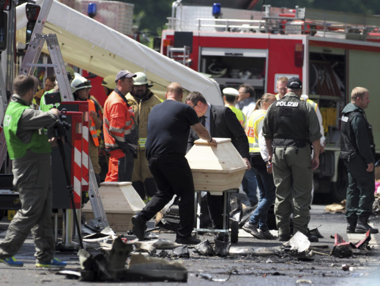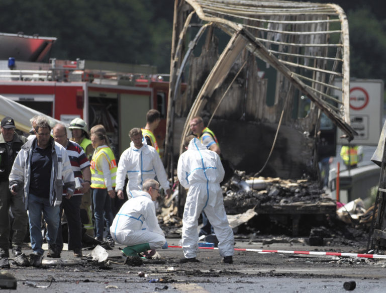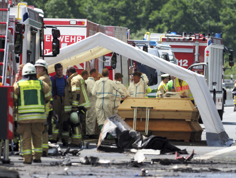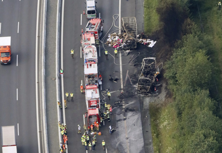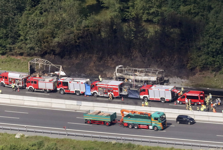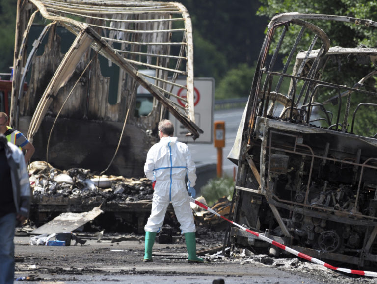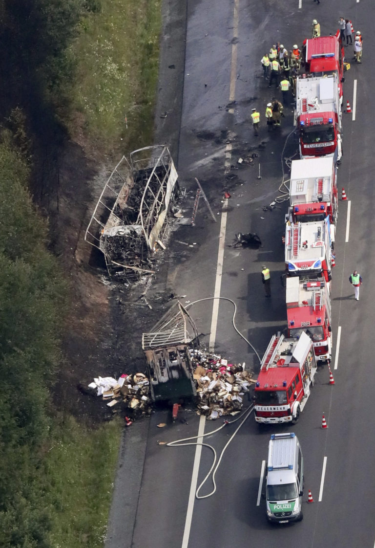 Na diaľnici A9 v blízkosti nemeckého mesta Münchberg v pondelok ráno narazil autobus do nákladného auta a následne začal horieť. Foto: Nicolas Amer/dpa via AP.