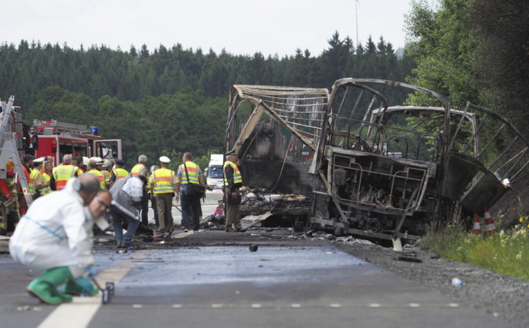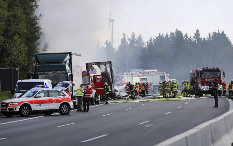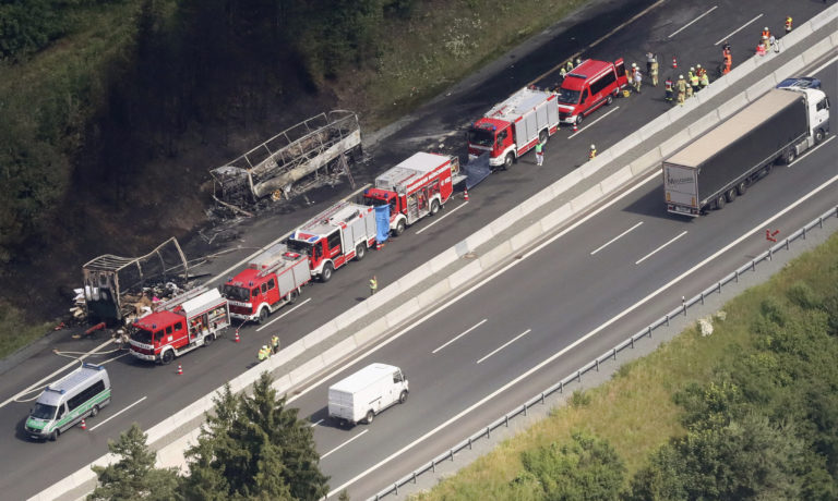 Na diaľnici A9 v blízkosti nemeckého mesta Münchberg v pondelok ráno narazil autobus do nákladného auta a následne začal horieť.