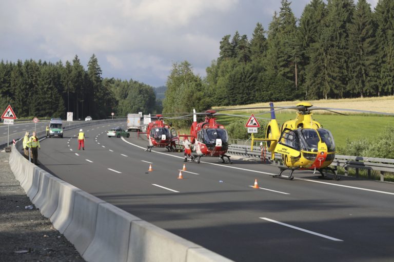 Na diaľnici A9 v blízkosti nemeckého mesta Münchberg v pondelok ráno narazil autobus do nákladného auta a následne začal horieť. Foto: Nicolas Armer/dpa via AP.