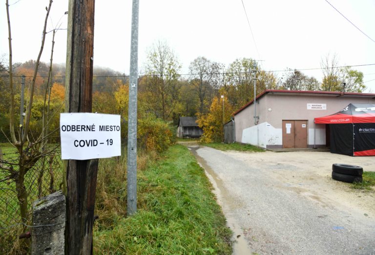 Pohľad na odberné miesto vedľa hasičskej stanice dobrovoľných hasičov v miestnej časti Topolecká v Starej Turej pred plošným testovaním obyvateľov na Slovensku v rámci operácie Spoločná zodpovednosť. Stará Turá, 30. október 2020. Foto: SITA/Martin Medňanský.