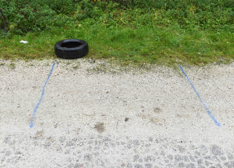 Vyznačené rozostupy pre ľudí, ktorí budú čakať na testovanie v odbernom mieste vedľa hasičskej stanice dobrovoľných hasičov v časti Topolecká-Stará Turá počas príprav na plošné testovanie obyvateľov na Slovensku v rámci operácie Spoločná zodpovednosť. Stará Turá, 30. október 2020. Foto: SITA/Martin Medňanský