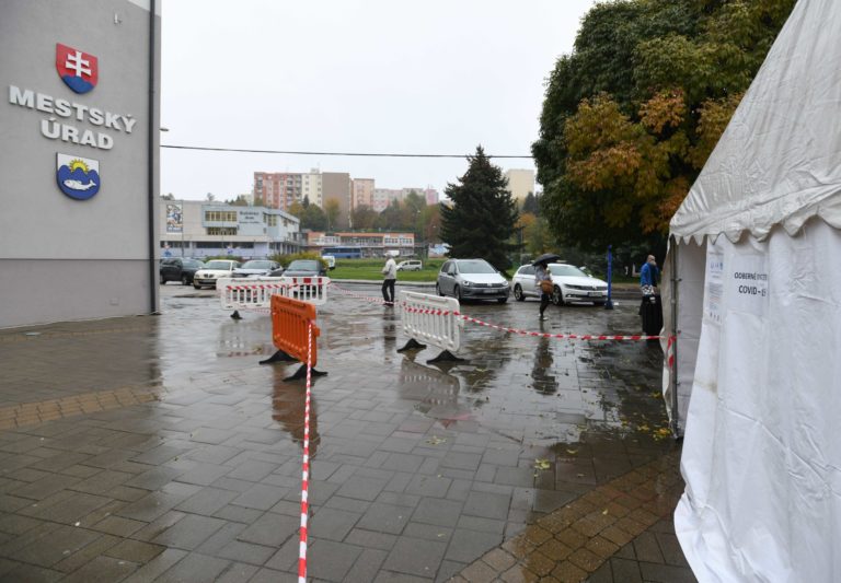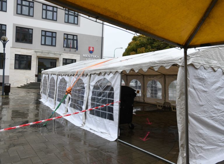 Odberné miesto pred mestským úradom v Myjave počas príprav na plošné testovanie obyvateľov na Slovensku na COVID-19 v rámci operácie Spoločná zodpovednosť. Myjava, 30. október 2020. Foto: SITA/Martin Medňanský.