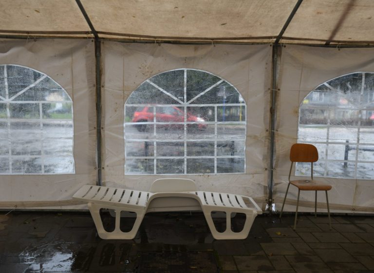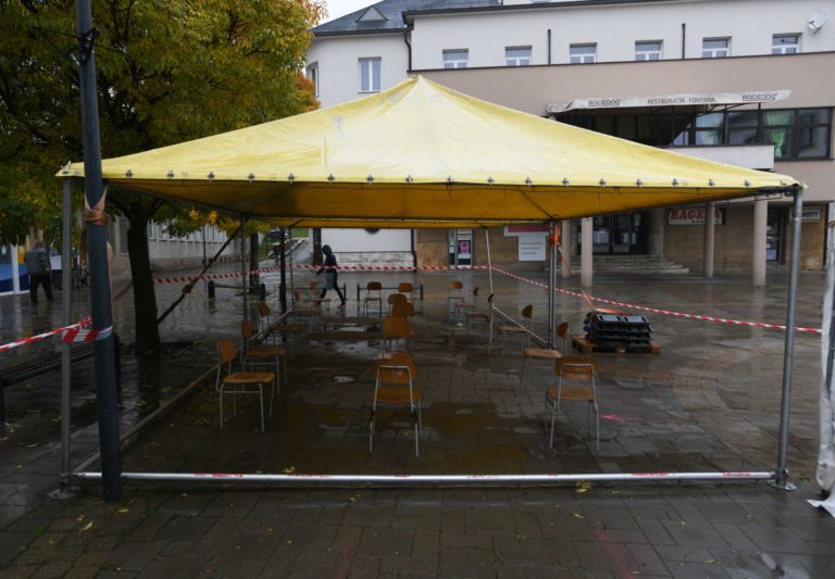 Vyhradený priestor pre ľudí, ktorý sa dajú testovať vo veľkokapacitnom stane v odbernom mieste pred Mestským úradom v Myjave počas príprav na plošné testovanie obyvateľov Slovenska na COVID-19 v rámci operácie Spoločná zodpovednosť. Myjava, 30. október 2020. Foto: SITA/Martin Medňanský.