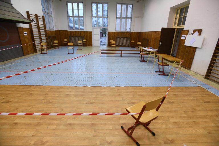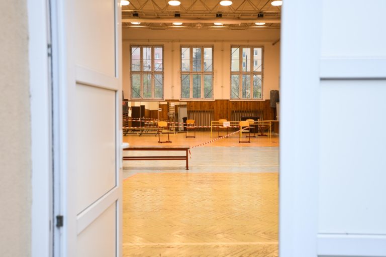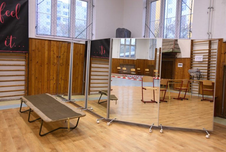 Odberné miesto v telocvični Základnej umeleckej školy v Starej Turej počas príprav na plošné testovanie obyvateľov Slovenska na COVID-19 v rámci operácie Spoločná zodpovednosť. Stará Turá, 30. október 2020. Foto: SITA/Martin Medňanský.