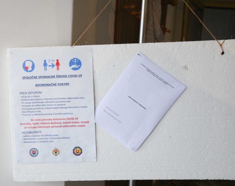 Oznam v odbernom mieste na Mestskom úrade v Starej Turej počas príprav na plošné testovanie obyvateľov Slovenska na COVID-19 v rámci operácie Spoločná zodpovednosť. Stará Turá, 30. október 2020. Foto: SITA/Martin Medňanský.