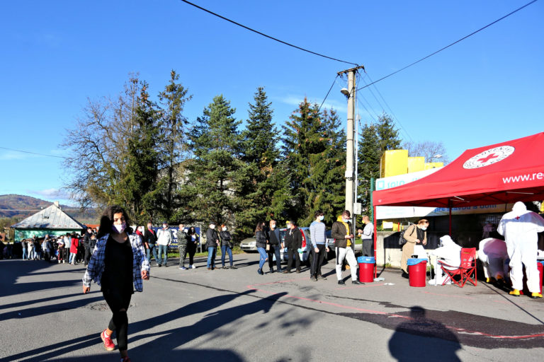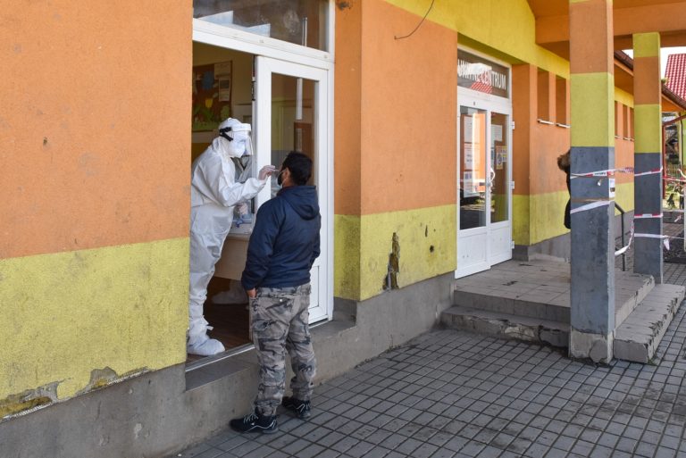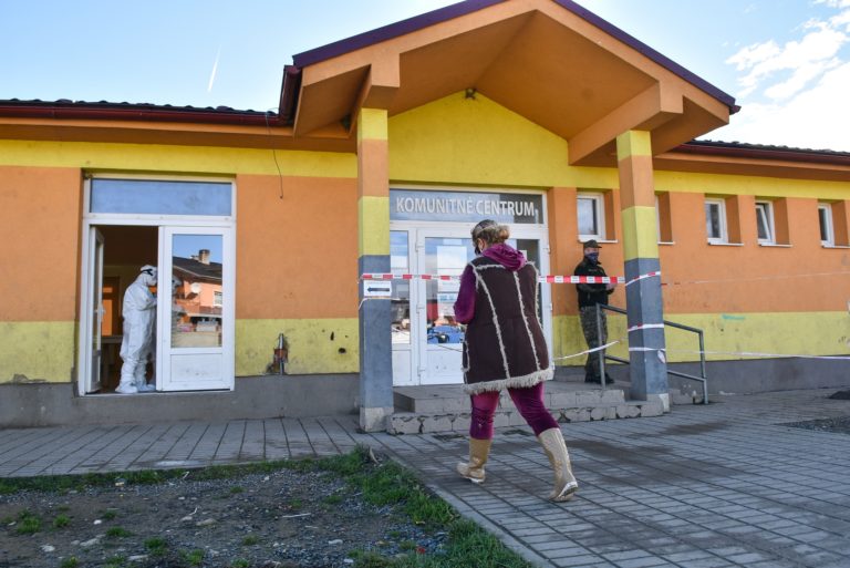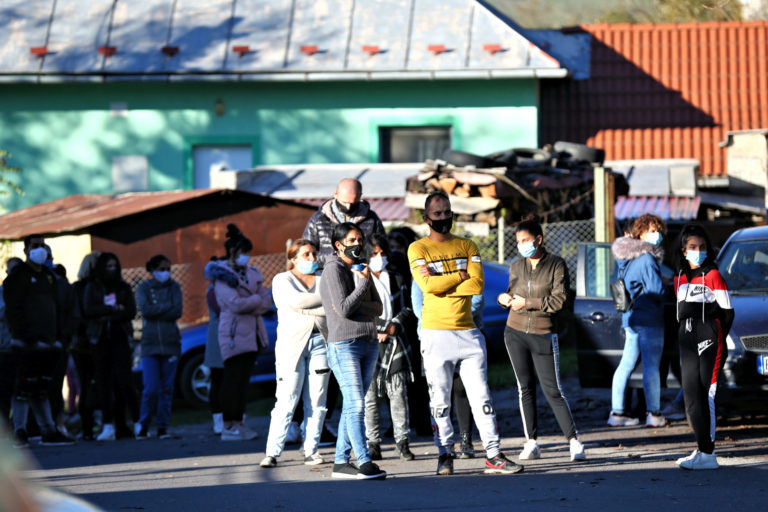 Obyvatelia obce čakajú v odbernom mieste COVID-19 v rómskej osade v obci Veľká Lomnica počas operácie Spoločná zodpovednosť, ktorá by mala zabezpečiť celoplošné testovanie obyvateľov Slovenska antigénovým testom na COVID-19. Veľká Lomnica, okr. Kežmarok, 31. október 2020. Foto: SITA/Oliver Ondráš.