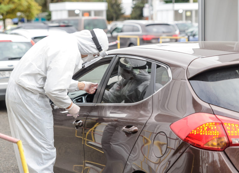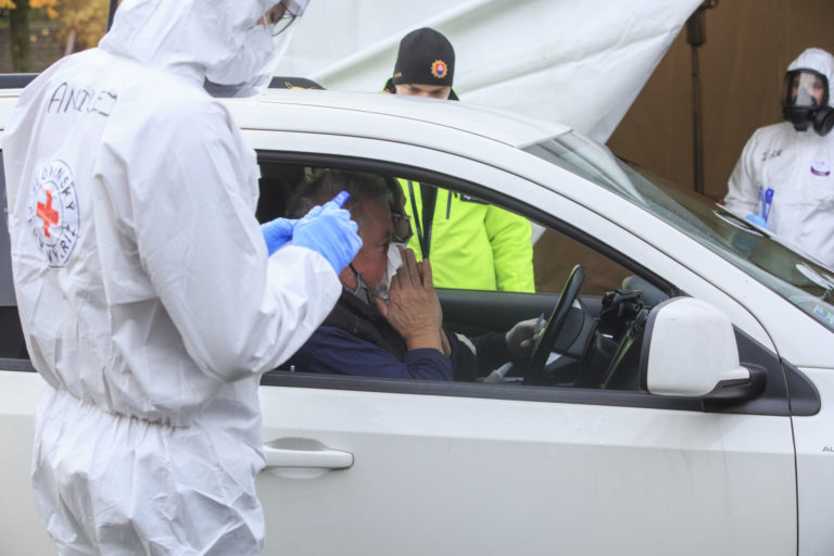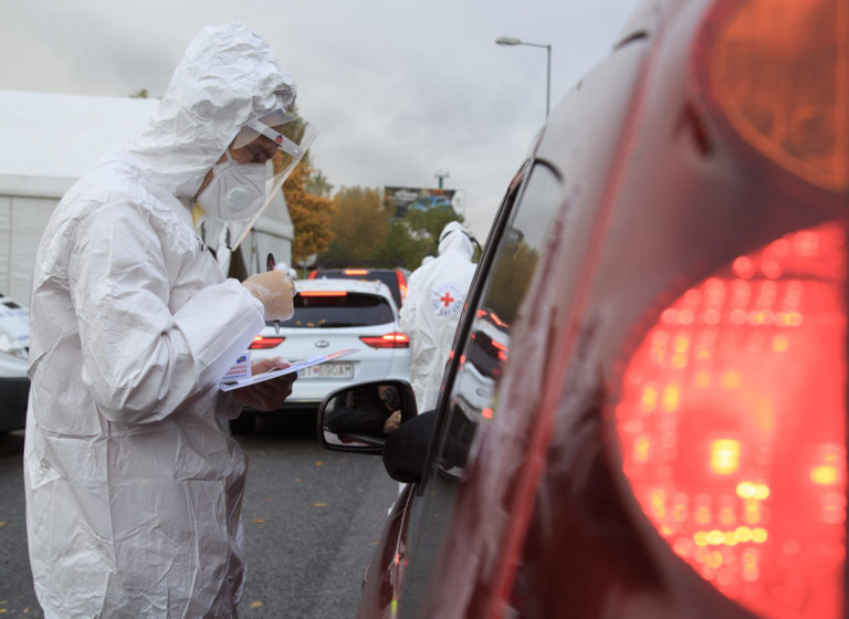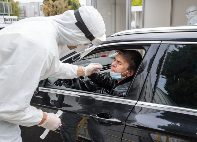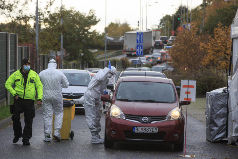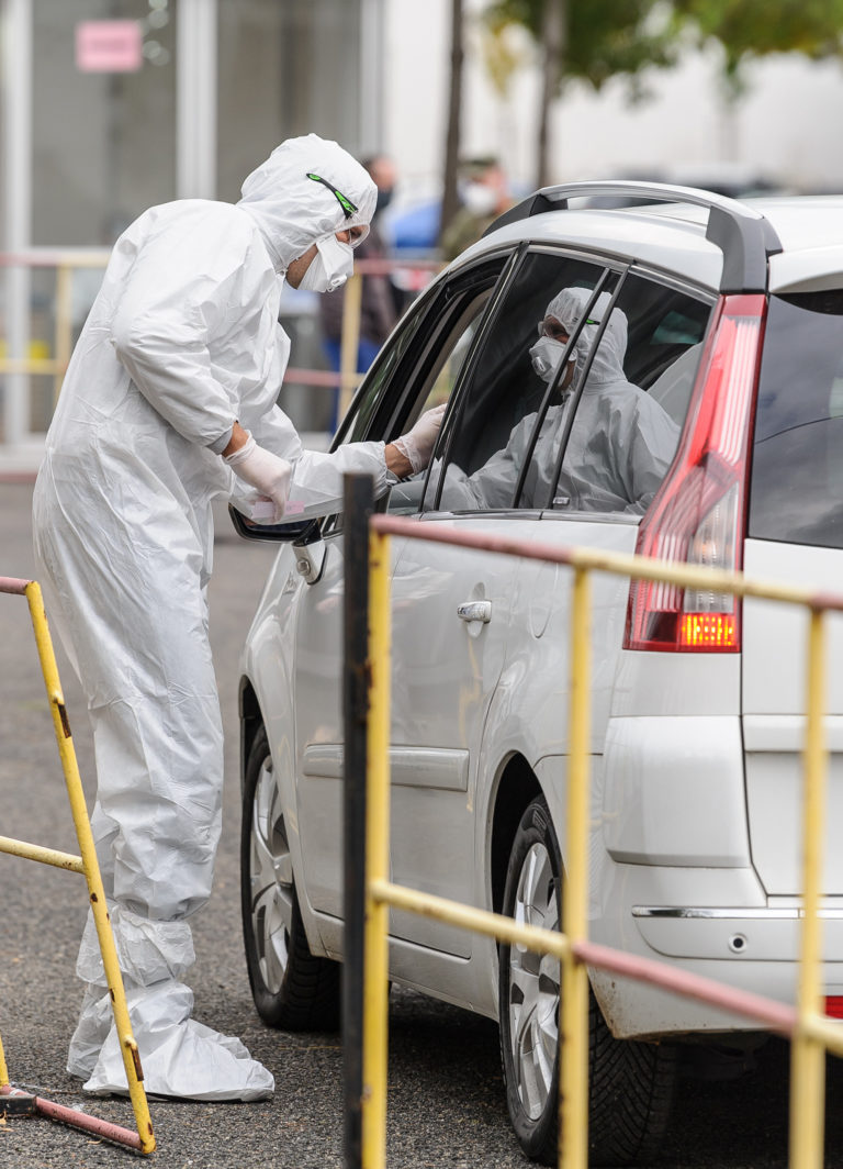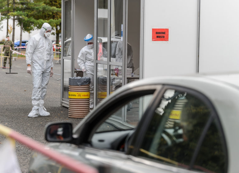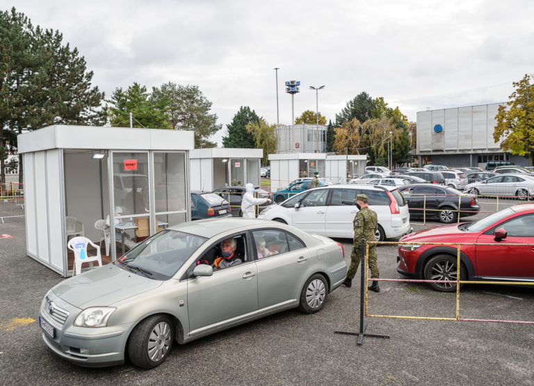 Odber na drive-through testovaní COVID-19 pri bratislavskom OC DANUBIA počas operácie Spoločná zodpovednosť, ktorá by mala zabezpečiť celoplošné testovanie obyvateľov Slovenska, antigénovým testom na COVID-19. Bratislava, 31. október 2020. Foto: SITA/Ľudovít Vaniher,