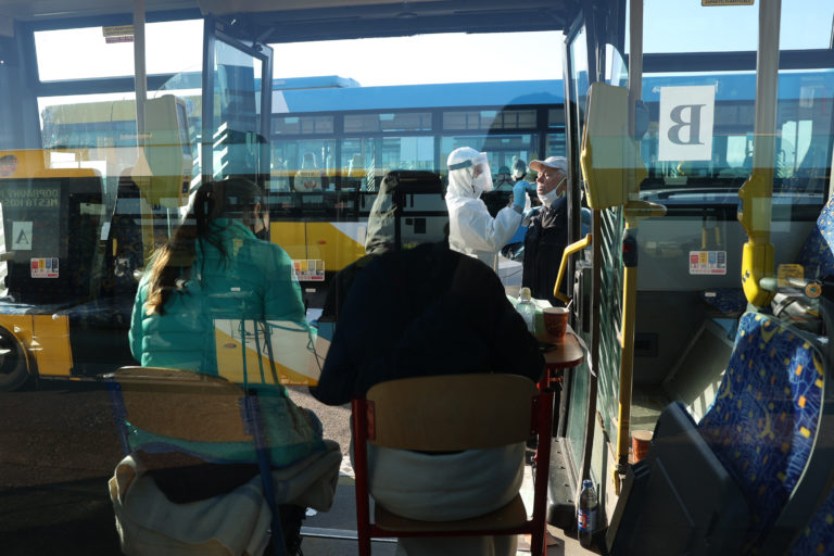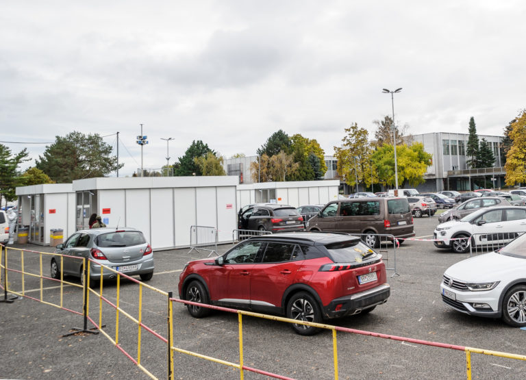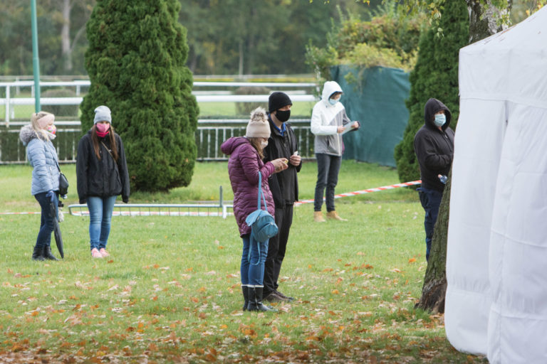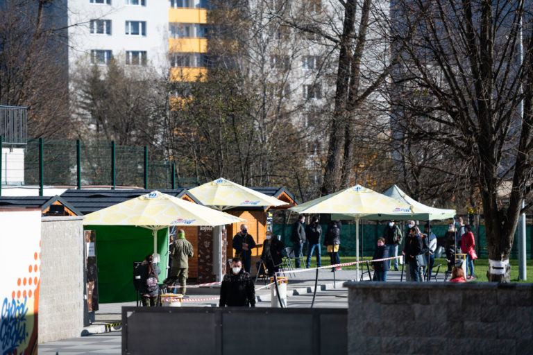 Atmosféra na Štátnom závodisku, kde je jedno z odberných miest COVID-19 v bratislavskej mestskej časti Petržalka počas operácie Spoločná zodpovednosť, ktorá by mala zabezpečiť celoplošné testovanie obyvateľov Slovenska antigénovým testom na COVID-19. Bratislava, 31. októbra 2020. Foto: SITA/Ľudovít Vaniher.